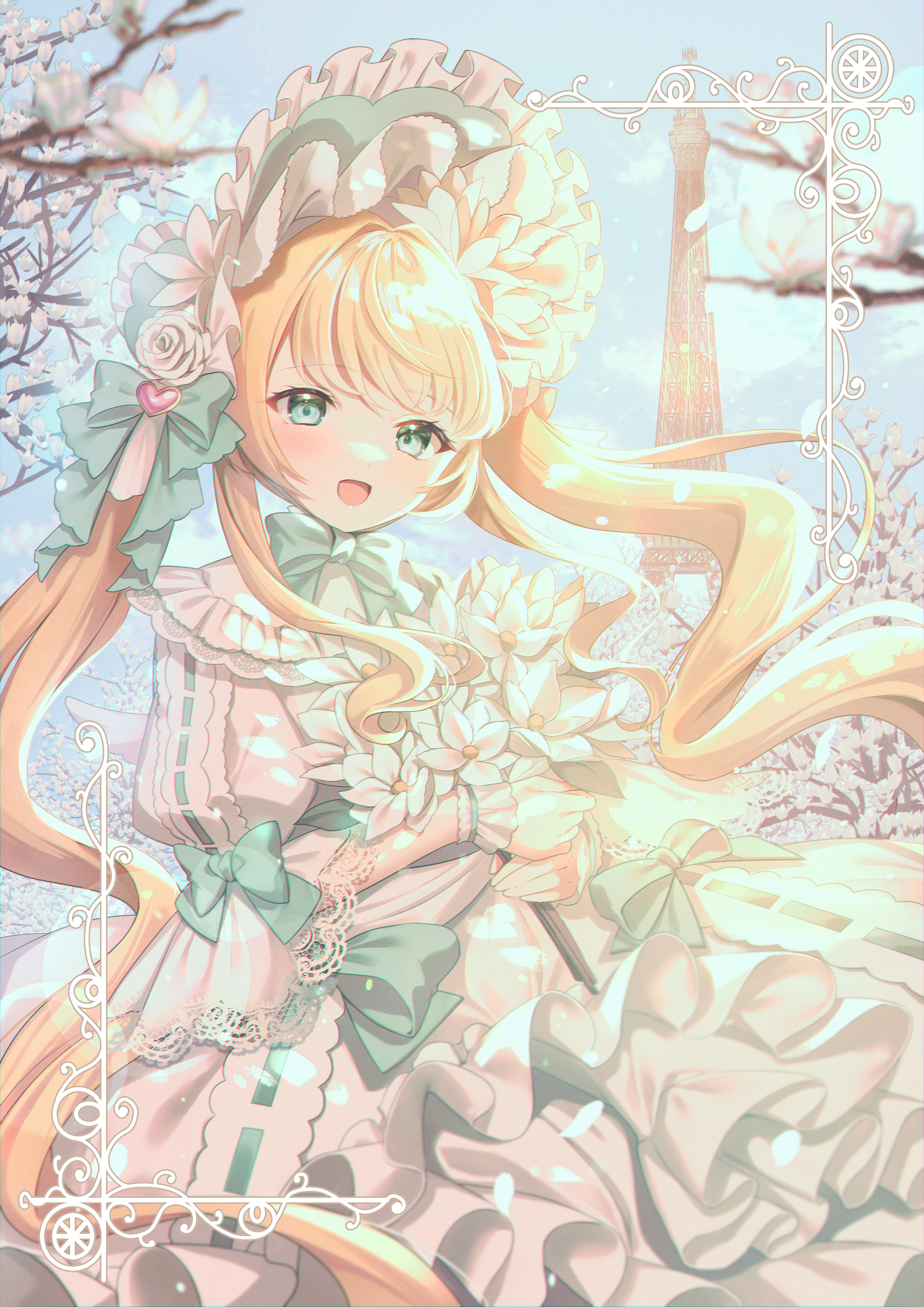 1girl :d absurdres blonde_hair blurry bonnet border bouquet bow bowtie chromatic_aberration collar depth_of_field dress eiffel_tower floating_hair flower frilled_bonnet frilled_collar frilled_dress frilled_wrist_cuffs frills green_bow green_bowtie green_eyes highres hime_lolita holding holding_bouquet inset_border lace-trimmed_sleeves lace_trim lolita_fashion long_hair looking_at_viewer lushuao open_mouth original ornate_border outdoors petticoat puffy_sleeves smile solo standing sweet_lolita three-quarter_sleeves twintails very_long_hair white_dress white_flower wrist_cuffs