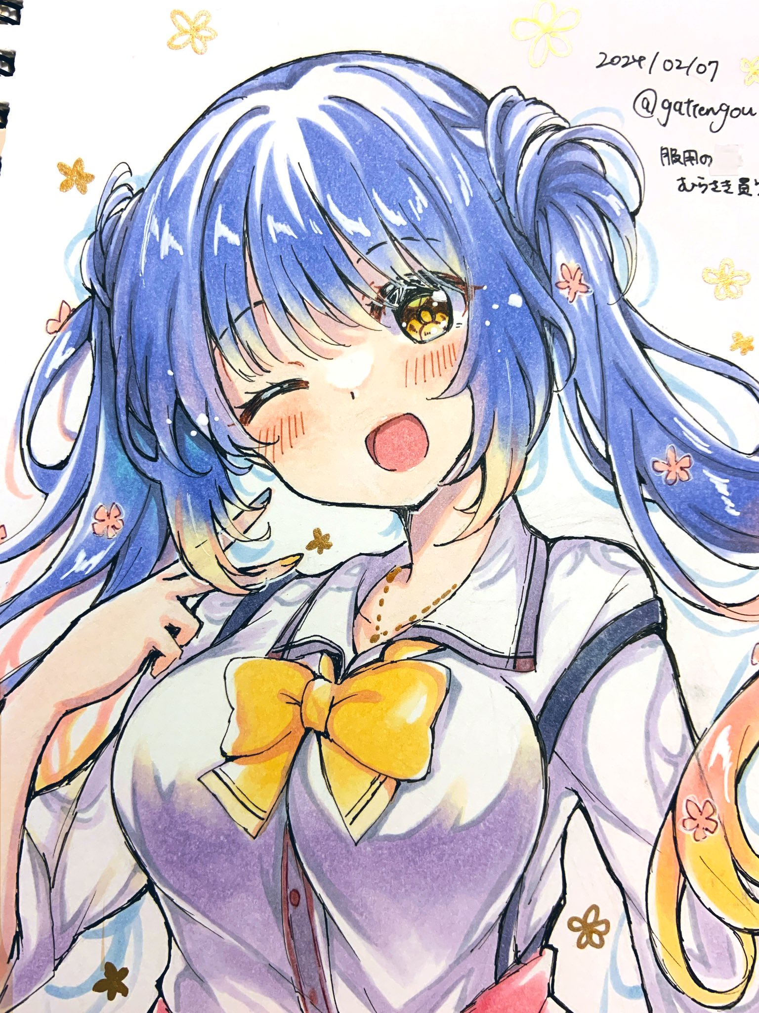 1girl 2024 ;d arm_at_side blonde_hair blue_hair blue_nails blush bow breasts collared_shirt commentary dated eyelashes floating_hair flower gattengou gradient_hair gyaru hair_between_eyes hair_flower hair_ornament hand_up happy highres jewelry kogal kohibari_kurumi large_breasts long_hair long_sleeves looking_at_viewer multicolored_hair nail_polish necklace one_eye_closed open_mouth pink_flower school_uniform shirt simple_background smile solo suspenders tenshi_souzou_re-boot! traditional_media twintails twitter_username upper_body v white_background white_shirt yellow_bow yellow_eyes yellow_nails
