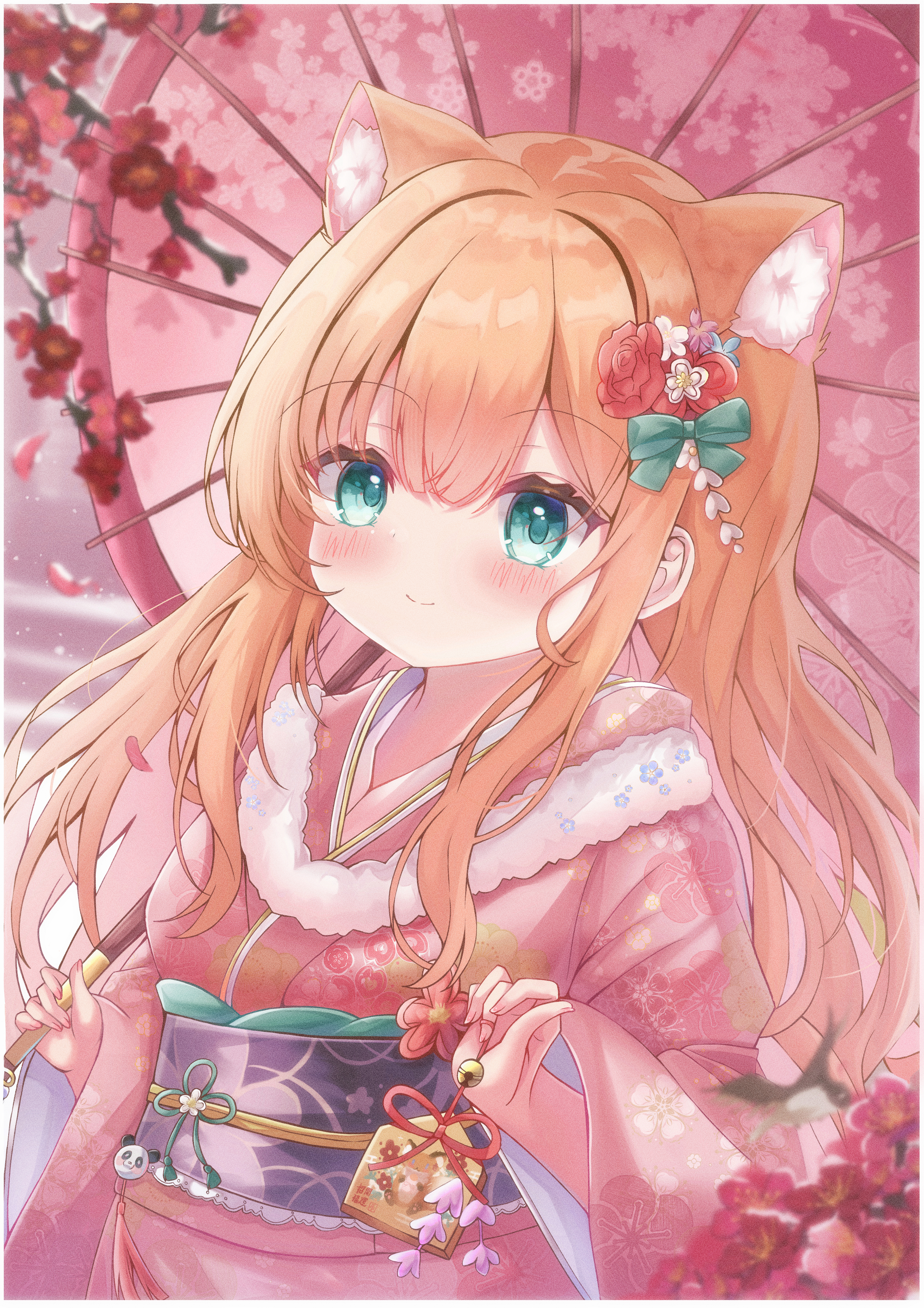 1girl absurdres animal_ear_fluff animal_ears bell blurry blush border bow depth_of_field ema floral_print flower fur_collar green_bow green_eyes hair_between_eyes hair_flower hair_ornament highres holding holding_umbrella japanese_clothes jingle_bell kanzashi kimono long_hair nayqws obi oil-paper_umbrella orange_hair original pink_kimono red_flower sash sidelocks smile umbrella wavy_hair white_border
