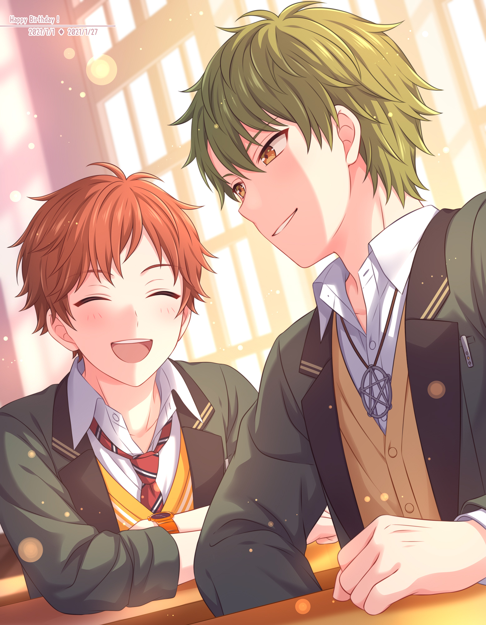 2boys blurry blush bokeh cardigan closed_eyes collared_shirt commentary_request dated depth_of_field desk green_hair green_jacket happy_birthday highres indoors jacket jewelry kamiya_inori kojo_arata long_sleeves looking_at_another male_focus multiple_boys necklace necktie on_air! open_mouth orange_hair orange_vest pentagram red_necktie school_uniform sekina shirt smile striped_clothes striped_necktie teeth upper_teeth_only vest watch white_shirt wristwatch yellow_cardigan yellow_eyes