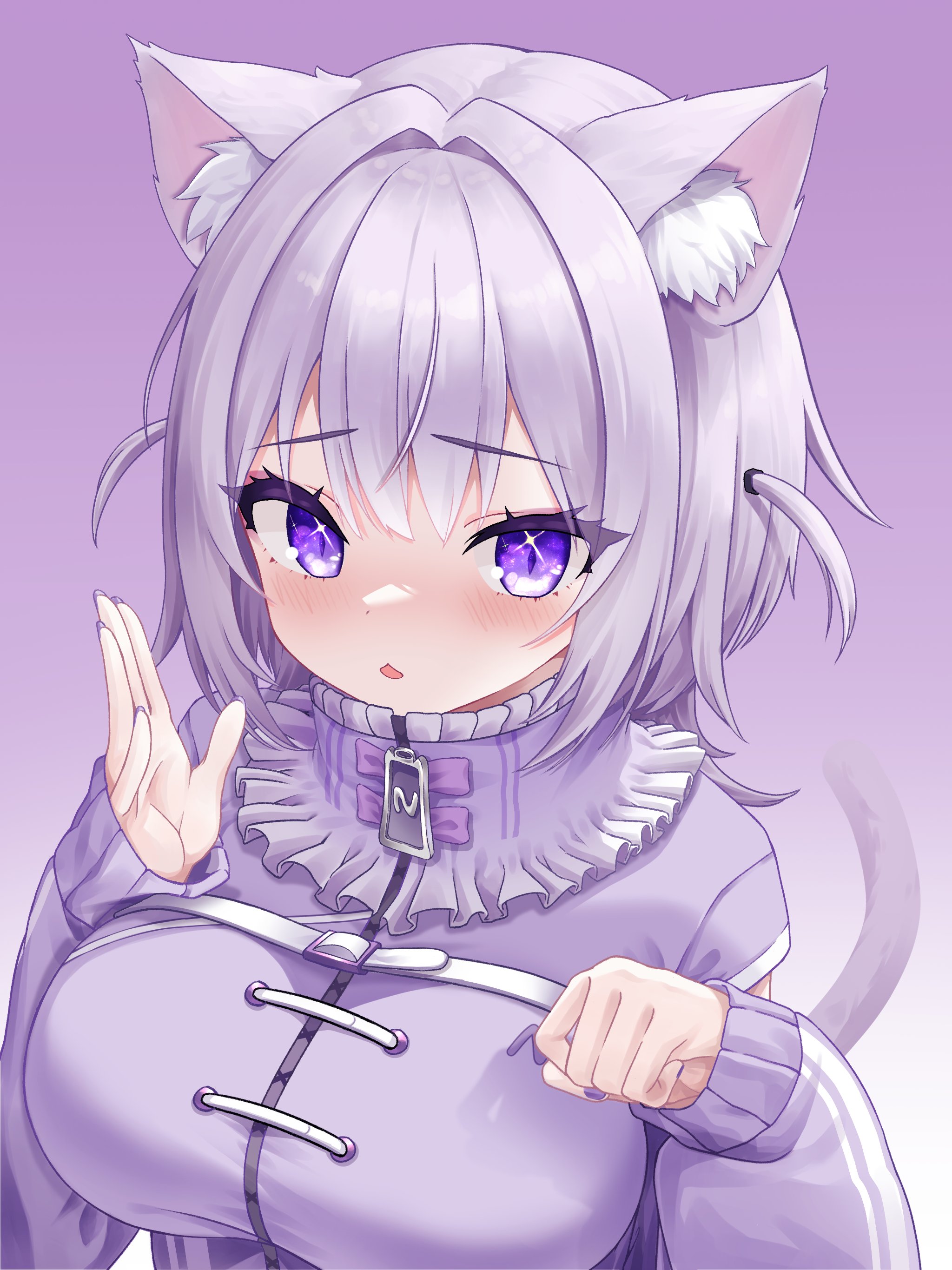 1girl absurdres animal_ear_fluff animal_ears blush cat_ears cat_girl cat_tail gyoza_(pixiv17855879) highres hololive jacket looking_at_viewer medium_hair nail_polish nekomata_okayu nekomata_okayu_(membership) official_alternate_costume purple_background purple_eyes purple_hair purple_jacket purple_nails tail two_side_up virtual_youtuber