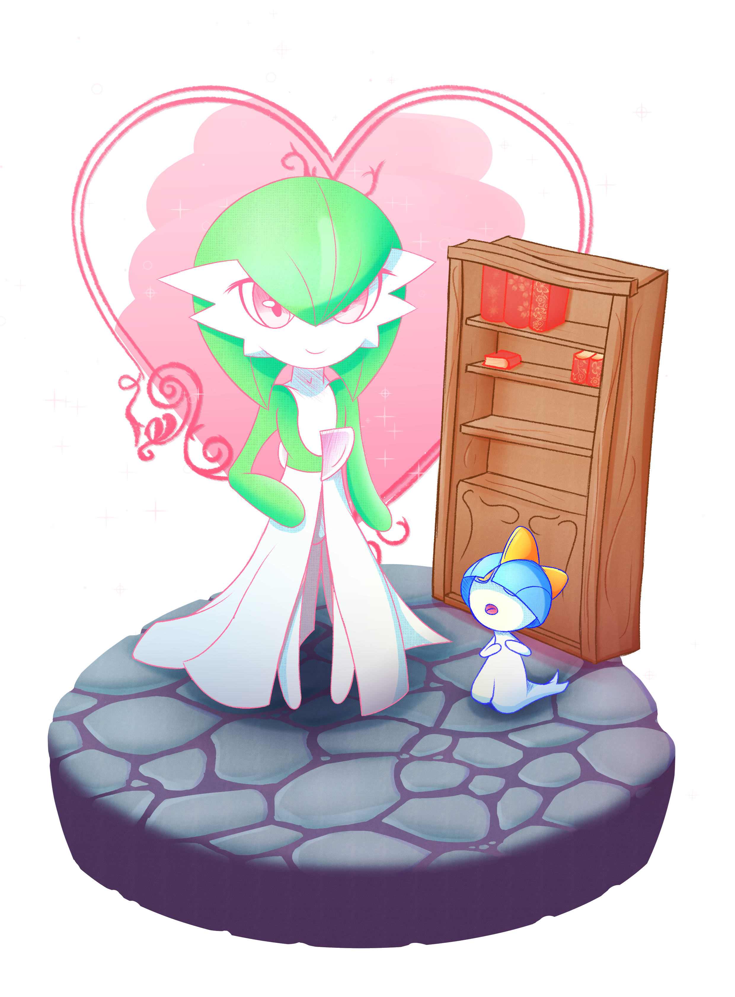 1girl 1other absurdres alternate_color arm_at_side blue_hair blunt_bangs bob_cut book bookshelf bowl_cut chibi chibi_only closed_mouth colored_skin flat_chest full_body gardevoir gen_3_pokemon green_hair green_skin hair_between_eyes hair_over_eyes hands_up happy heart heart_background highres looking_at_another looking_up multicolored_skin nintendo no_feet open_mouth orange_eyes pink_eyes pokemon pokemon_(creature) polyvoir ralts shiny_pokemon short_hair smile sparkle standing transparent_background two-tone_skin white_skin