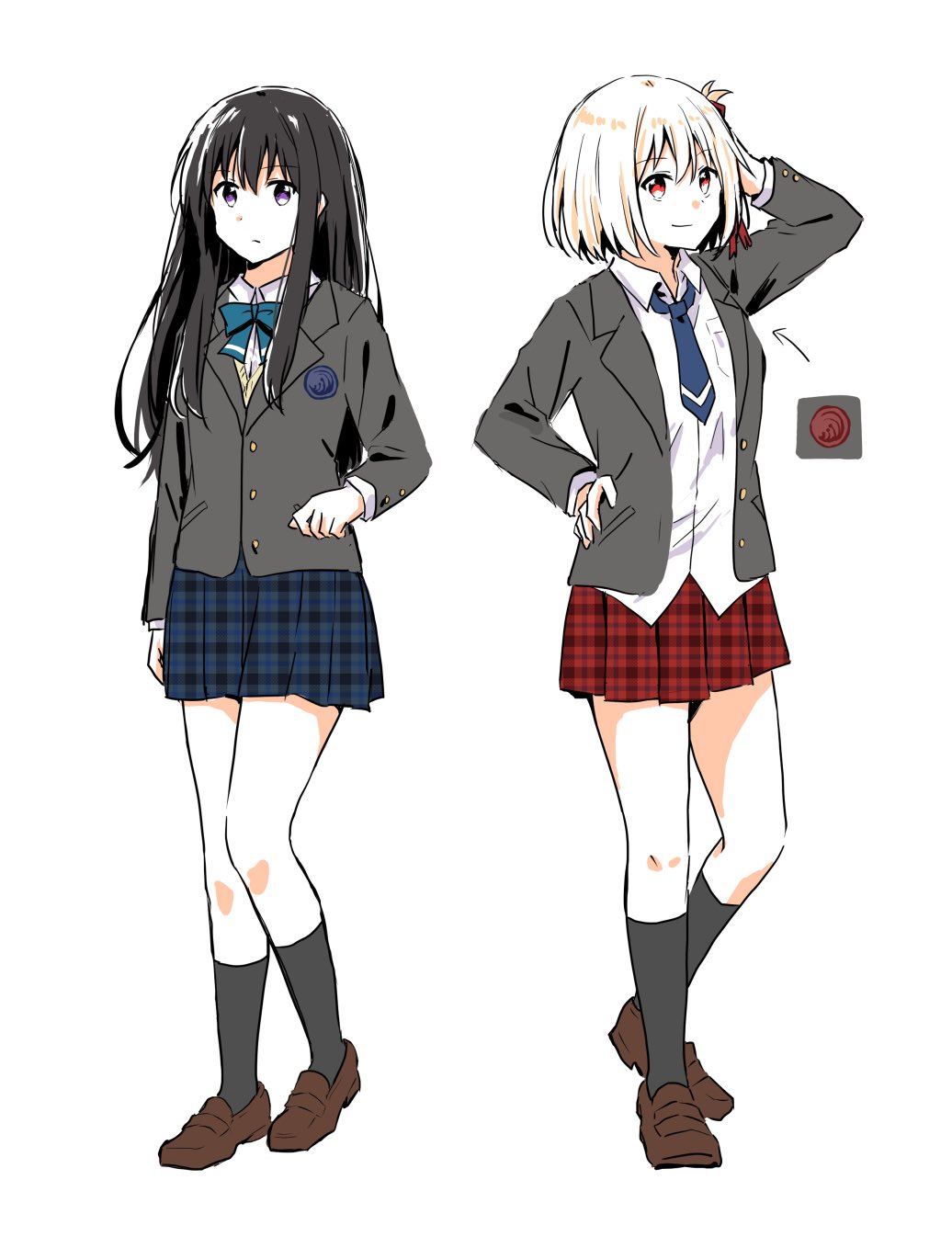 2girls arrow_(symbol) black_hair blonde_hair blue_bow blue_bowtie blue_necktie blue_skirt bow bowtie brown_footwear closed_mouth commentary full_body grey_jacket grey_socks hand_on_own_head hand_on_own_hip highres inoue_takina isumi jacket kneehighs loafers long_hair long_sleeves looking_at_viewer lycoris_recoil multiple_girls necktie nishikigi_chisato open_clothes open_jacket plaid_clothes plaid_skirt pleated_skirt red_eyes red_skirt school_uniform shirt shoes short_hair skirt socks standing white_shirt