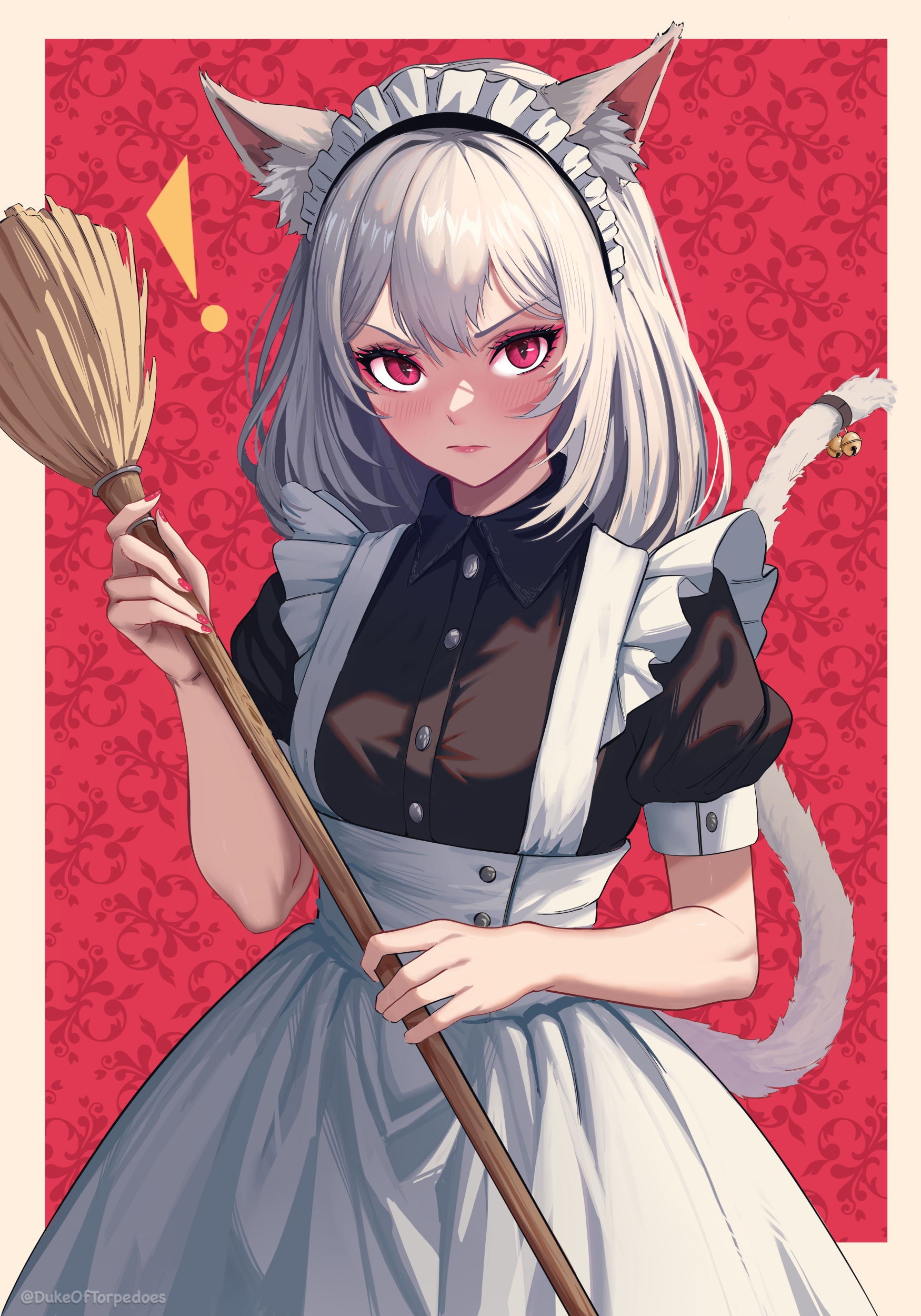 >:( 1girl absurdres animal_ear_fluff animal_ears black_shirt border broom cat_ears cat_girl cat_tail dress_shirt dukeoftorpedoes highres holding holding_broom looking_at_viewer maid maid_headdress medium_hair nail_polish original red_background red_eyes shirt short_sleeves simple_background tail v-shaped_eyebrows white_background white_border white_hair