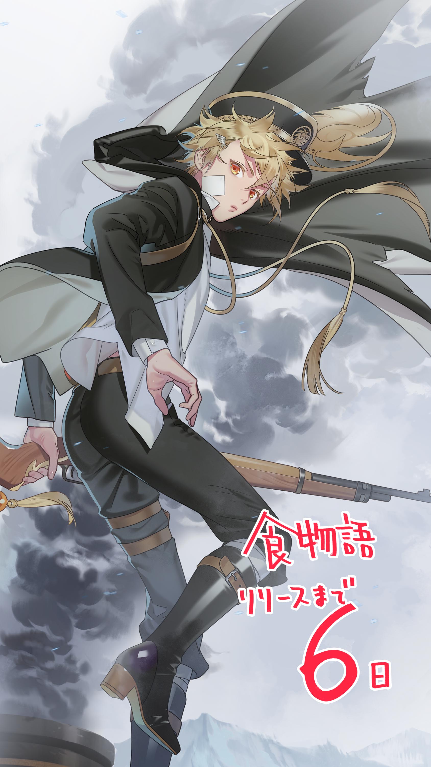 1boy absurdres belt black_boots black_cape black_headwear black_jacket blonde_hair boots brown_belt cape closed_mouth countdown floating_cape from_behind fuli_chicken_(the_tale_of_food) gauze gauze_on_cheek gun hair_between_eyes hair_ornament hairclip highres holding holding_gun holding_weapon jacket kazuaki long_sleeves looking_at_viewer looking_back male_focus midriff_peek mountain open_clothes open_jacket orange_eyes popped_collar rifle shirt short_hair smoke solo standing standing_on_one_leg tassel the_tale_of_food thigh_strap untucked_shirt weapon white_shirt wind wing_hair_ornament