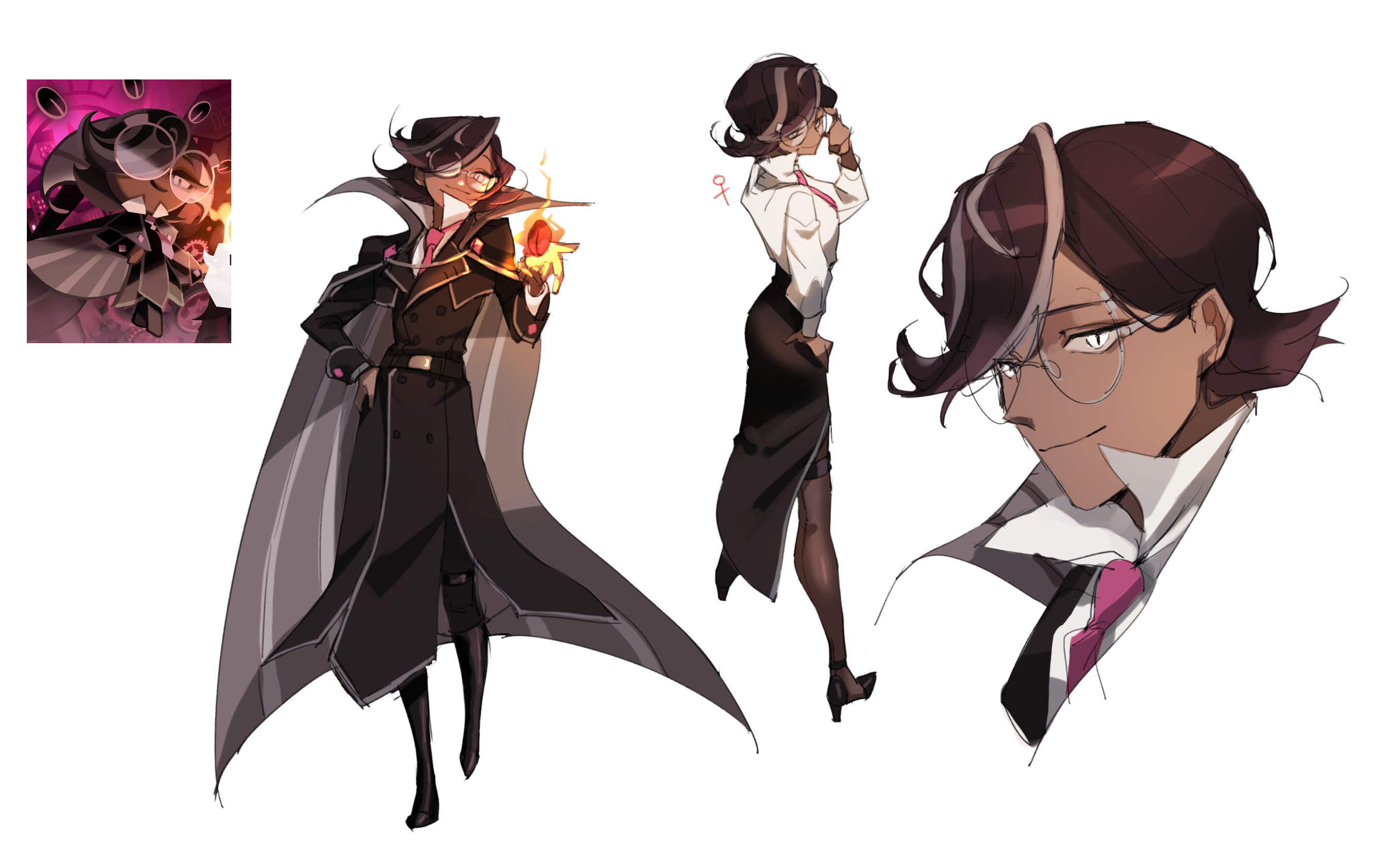 1boy 1girl androgynous belt black_belt black_coat black_footwear brown_hair brown_pantyhose buttons cape closed_mouth coat cookie_run cookie_run:_kingdom double-breasted espresso_cookie fire genderswap genderswap_(mtf) glasses high_collar high_heels highres long_sleeves looking_at_viewer migo45 multiple_views necktie pantyhose pencil_skirt pink_necktie pyrokinesis reference_inset round_eyewear shirt skirt slit_pupils smile white_eyes white_shirt