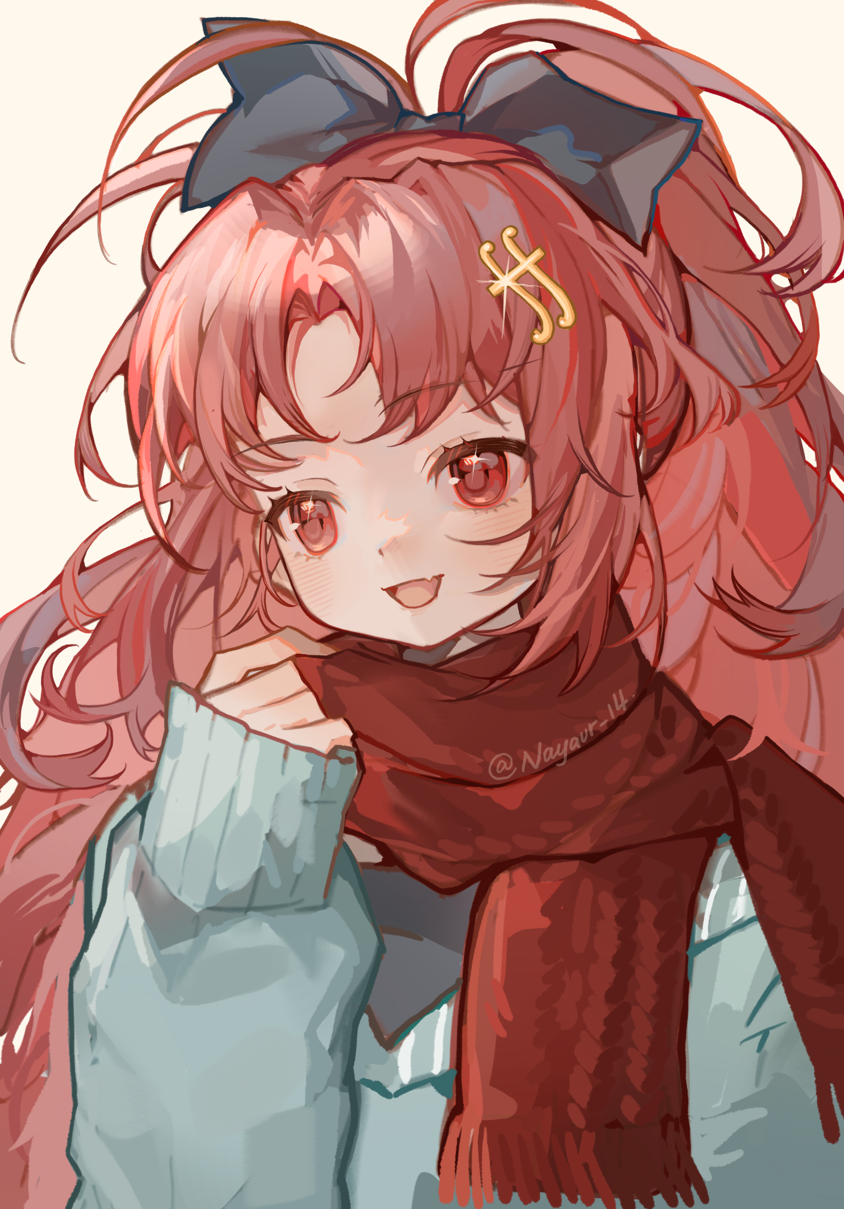1girl adjusting_scarf artist_name black_bow blue_jacket bow fang fortissimo glint hair_bow hair_ornament hand_up highres jacket long_hair long_sleeves looking_ahead mahou_shoujo_madoka_magica mahou_shoujo_madoka_magica_(anime) musical_note musical_note_hair_ornament open_mouth parted_bangs ponytail red_eyes red_hair red_scarf sakura_kyoko scarf shixiaoqina signature simple_background skin_fang smile solo upper_body yellow_background