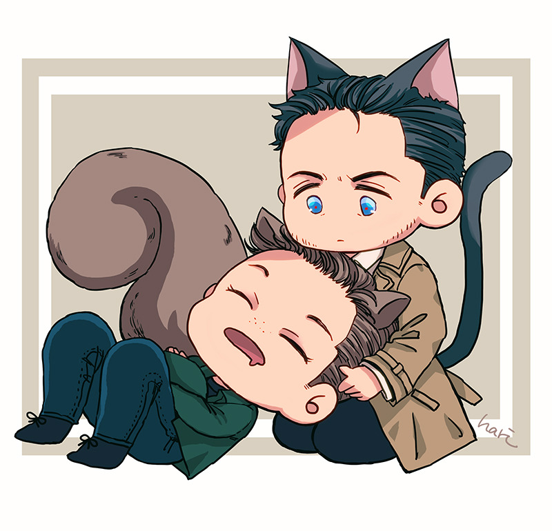 2boys animal_ears black_hair blue_eyes brown_hair castiel cat_boy cat_ears cat_tail chibi closed_eyes couple crossed_arms dean_winchester freckles full_body kemonomimi_mode lap_pillow looking_at_another male_focus multiple_boys noonmoon22 seiza short_hair sitting sleeping squirrel_boy squirrel_ears squirrel_tail supernatural_(tv_series) tail yaoi