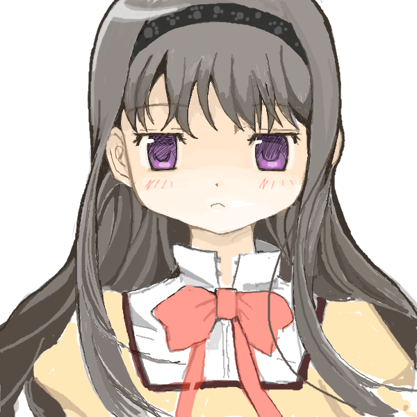 1girl akemi_homura bad_drawr_id bad_id black_hairband bow bowtie close-up collared_dress dress grey_hair hairband light_frown long_hair looking_at_viewer mahou_shoujo_madoka_magica mahou_shoujo_madoka_magica_(anime) oekaki paw_print purple_eyes red_bow red_bowtie sidelocks solo straight-on toshi_(little-fluffy-cloud) upper_body yellow_dress