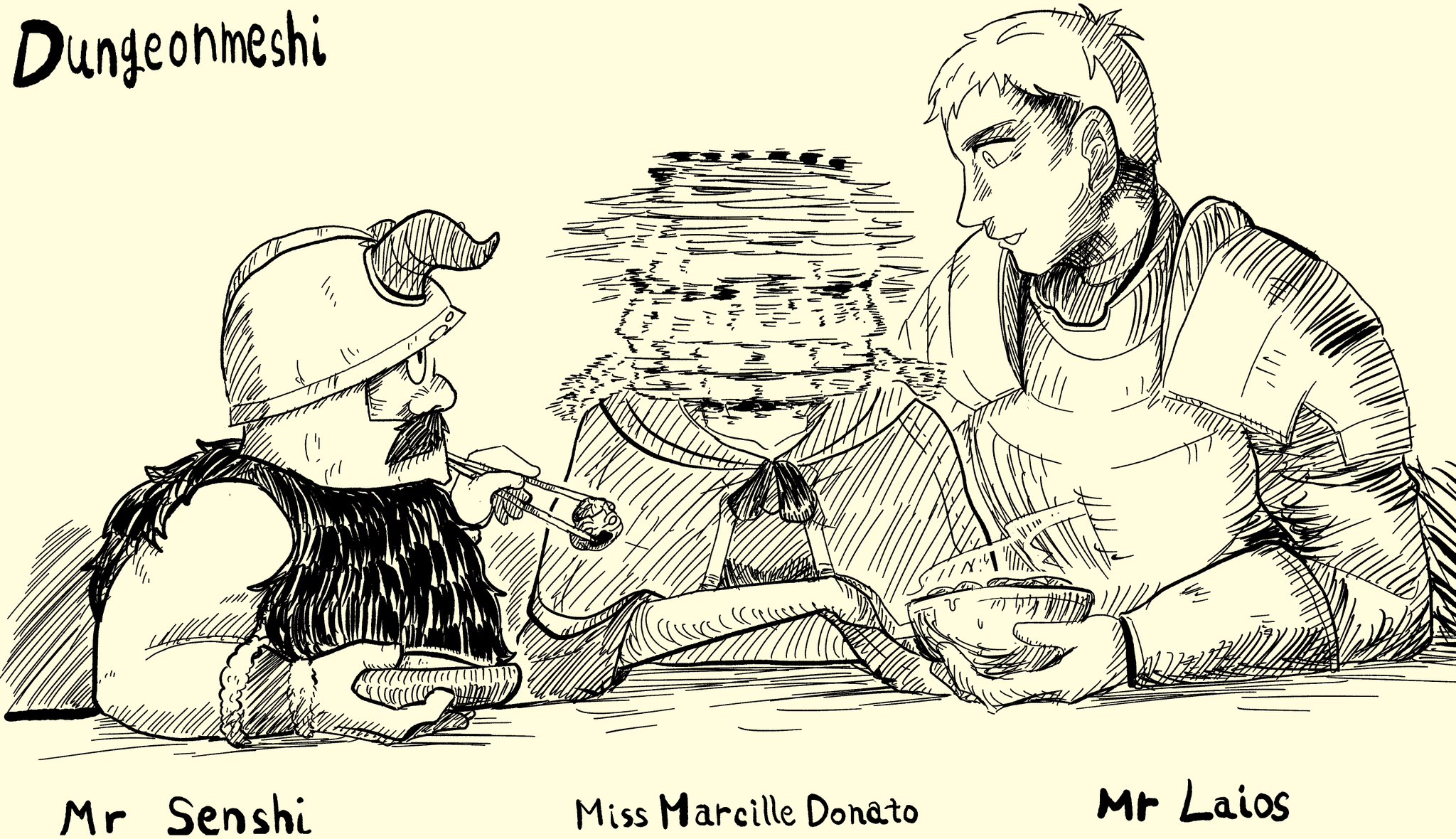 1girl 2boys afterimage arm_guards armor beard bowl capelet character_name chopsticks commentary copyright_name covered_mouth crossed_arms dungeon_meshi dwarf elf english_text facial_hair fake_horns feeding helmet highres holding holding_bowl holding_chopsticks holding_plate hood hood_down hooded_capelet horned_helmet horns laios_touden long_beard long_hair long_sleeves looking_at_another mandrake marcille_donato meme monochrome motion_blur multiple_boys mustache oniki7876 parody pauldrons plate plate_armor pointy_ears profile senshi_(dungeon_meshi) severed_head shaking_head short_hair shoulder_armor simple_background steam the_weaker_sex_1_(gibson) upper_body vambraces
