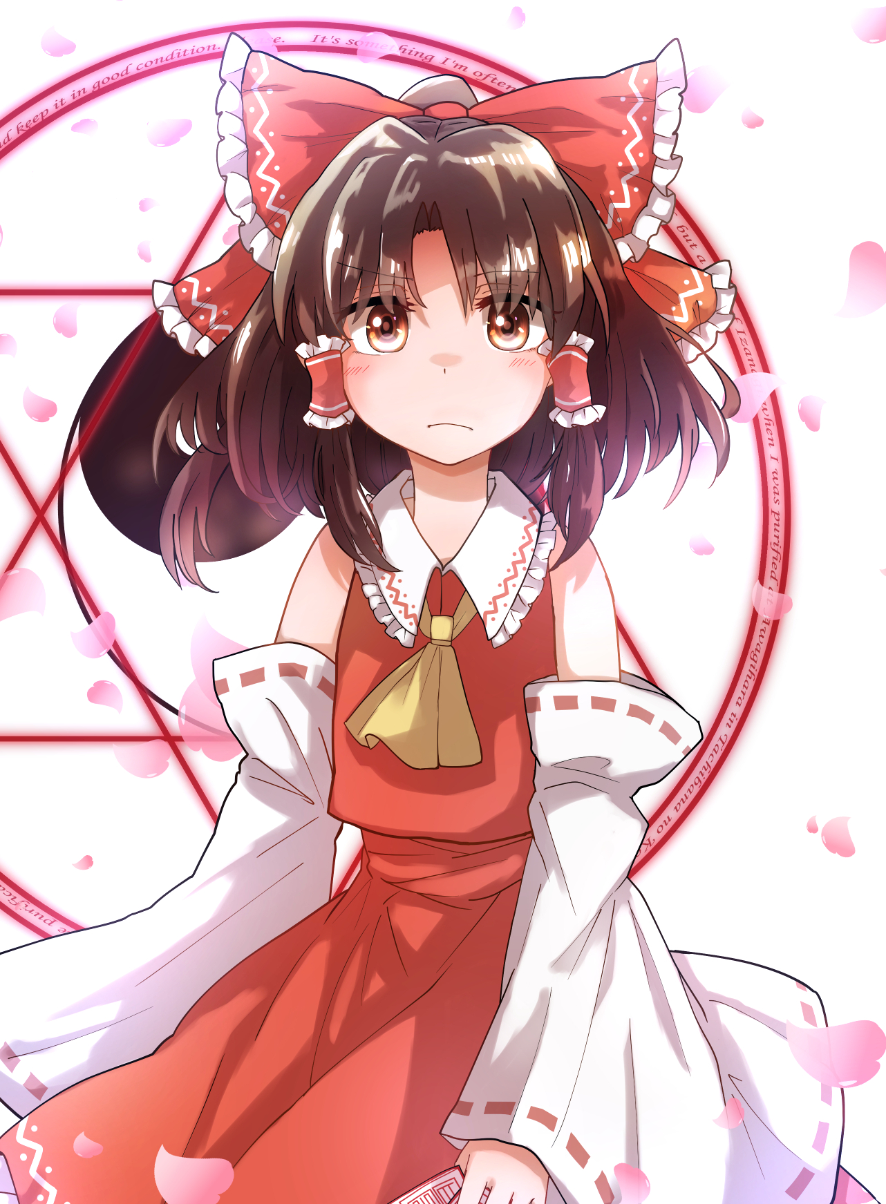 1girl ascot bare_shoulders blush bow brown_eyes brown_hair closed_mouth commentary_request cowboy_shot detached_sleeves flat_chest frilled_bow frilled_hair_tubes frilled_shirt_collar frills frown hair_bow hair_tubes hakurei_reimu highres holding holding_ofuda long_sleeves looking_at_viewer magic_circle medium_hair ofuda parted_bangs red_bow red_skirt red_vest ribbon-trimmed_sleeves ribbon_trim serious simple_background skirt skirt_set solo tigern touhou vest white_background wide_sleeves yellow_ascot