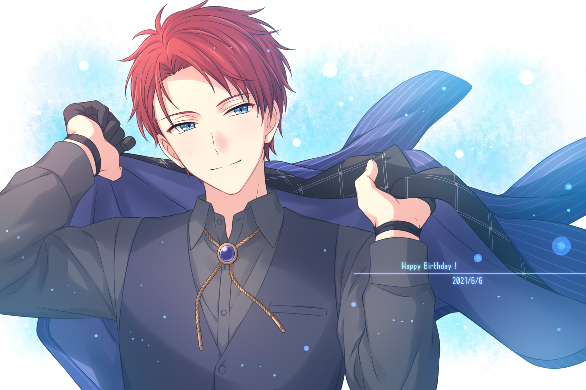 1boy black_gloves black_shirt black_vest blue_background blue_eyes blue_jacket brooch dated gloves gradient_background half_gloves hands_up happy_birthday highres holding holding_jacket holding_unworn_clothes jacket jewelry looking_at_viewer male_focus on_air! parted_bangs red_hair sekina shirt short_hair smile solo unworn_clothes unworn_jacket upper_body vest yarai_rikka
