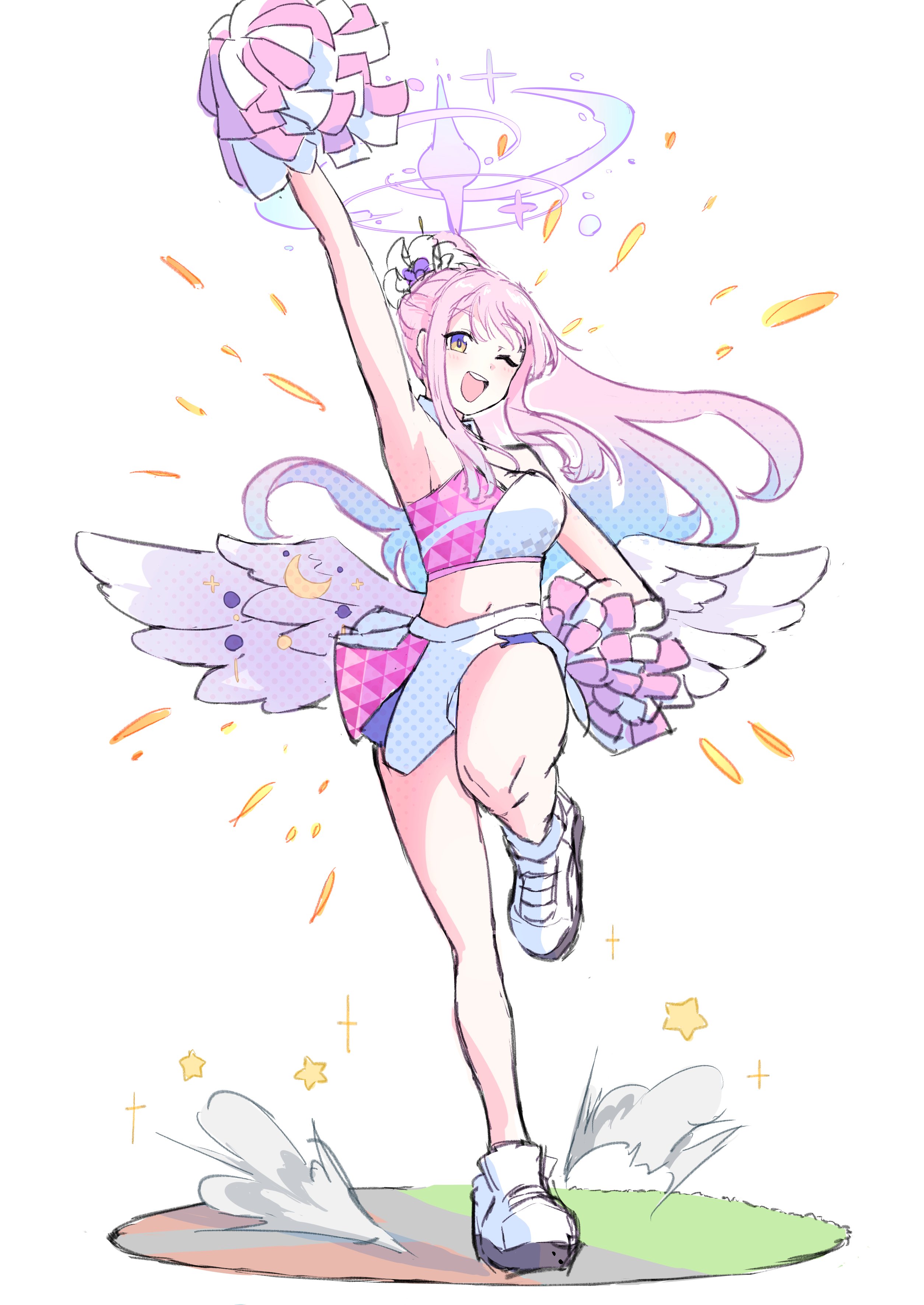 1girl absurdres blue_archive cheerleader crop_top feathered_wings hair_ornament hair_scrunchie halo herushi_shiko highres mika_(blue_archive) multicolored_eyes multicolored_hair navel pink_hair pink_halo pom_pom_(cheerleading) ponytail scrunchie shoes simple_background sneakers white_background white_shoes wings
