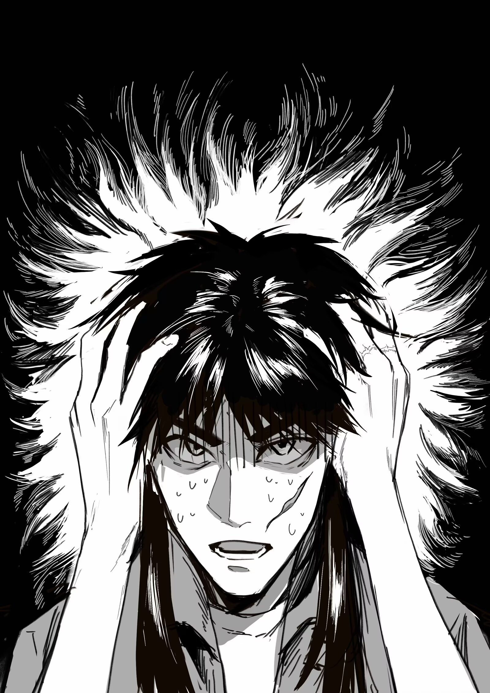 1boy facial_scar gloom_(expression) greyscale hands_on_own_head highres itou_kaiji tobaku_mokushiroku_kaiji long_hair looking_at_viewer lower_teeth_only male_focus monochrome open_mouth scar scar_on_cheek scar_on_face scar_on_hand sidelocks solo sweat teeth upper_body zhaiju2