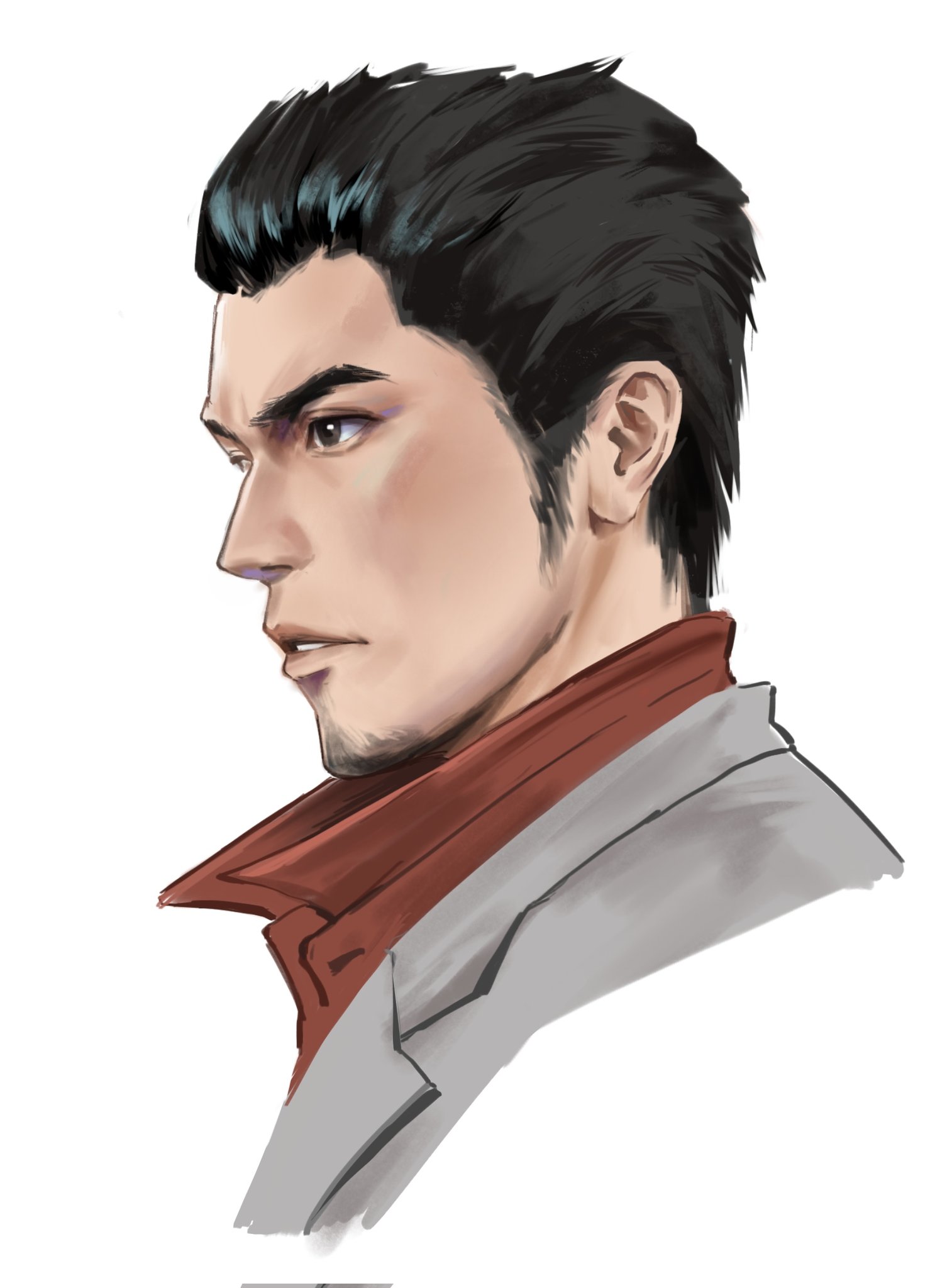 1boy black_hair blazer brown_eyes collared_shirt commentary corrupted_twitter_file expressionless facial_hair goatee grey_jacket hair_slicked_back highres jacket kiryu_kazuma looking_afar male_focus parted_lips popped_collar portrait red_shirt ryuu_ga_gotoku_(series) ryuu_ga_gotoku_1 shirt short_hair simple_background solo white_background zhaiju2