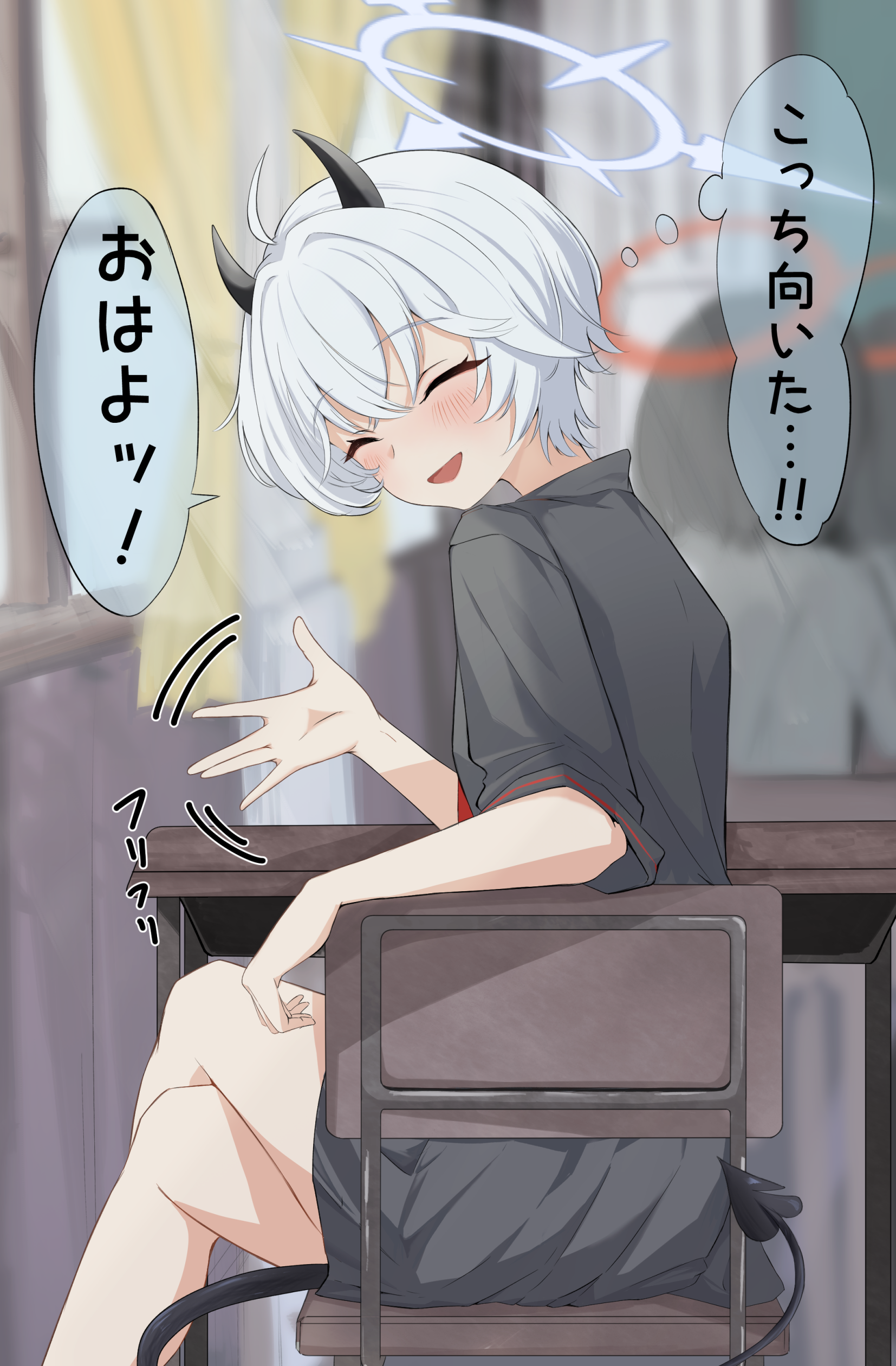 3girls 4jiri absurdres black_horns black_shirt black_skirt blue_archive blush chair closed_eyes demon_horns desk erika_(blue_archive) facing_viewer feet_out_of_frame grey_hair grey_halo halo highres horns indoors motion_lines multiple_girls open_mouth pleated_skirt red_halo school_chair school_desk shirt short_hair short_sleeves skirt smile solo_focus speech_bubble translation_request window