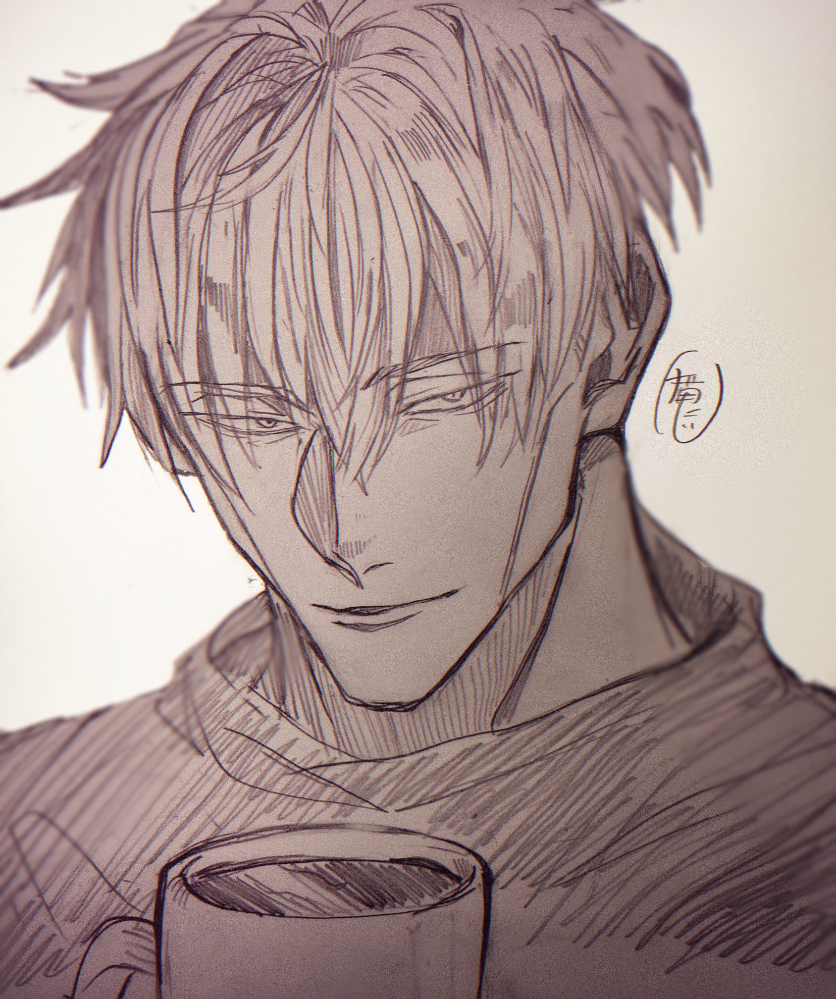 1boy coffee_mug cup highres jujutsu_kaisen looking_at_viewer male_focus monochrome mug nanami_kento nekonii parted_lips portrait short_hair solo