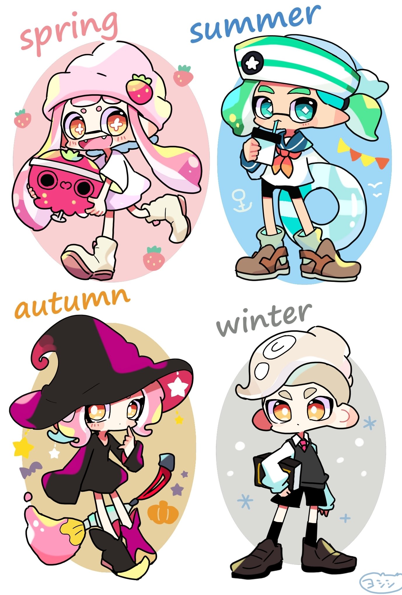 2boys 2girls aqua_eyes beanie bike_shorts black_socks book bright_pupils broom broom_riding brown_footwear closed_mouth commentary diamond-shaped_pupils diamond_(shape) drink drinking drinking_straw english_text fangs flower-shaped_pupils food fruit full_body green_hair hat highres holding holding_book inkbrush_(splatoon) inkling inkling_boy inkling_girl inkling_player_character lifebuoy long_hair long_sleeves medium_hair mohawk multiple_boys multiple_girls nintendo octoling octoling_boy octoling_girl octoling_player_character open_mouth orange_eyes pink_headwear pointy_ears print_headwear sailor_collar sailor_hat sailor_shirt seasons shirt shoes short_hair sleeves_past_fingers sleeves_past_wrists smile socks sparkle splatoon_(series) splatoon_3 standing star_(symbol) strawberry super_chump_(splatoon) swim_ring untranslatable_commentary symbol-shaped_pupils tentacle_hair thick_eyebrows translation_request walking white_hair white_pupils witch_hat yoshishi_(yosisitoho)