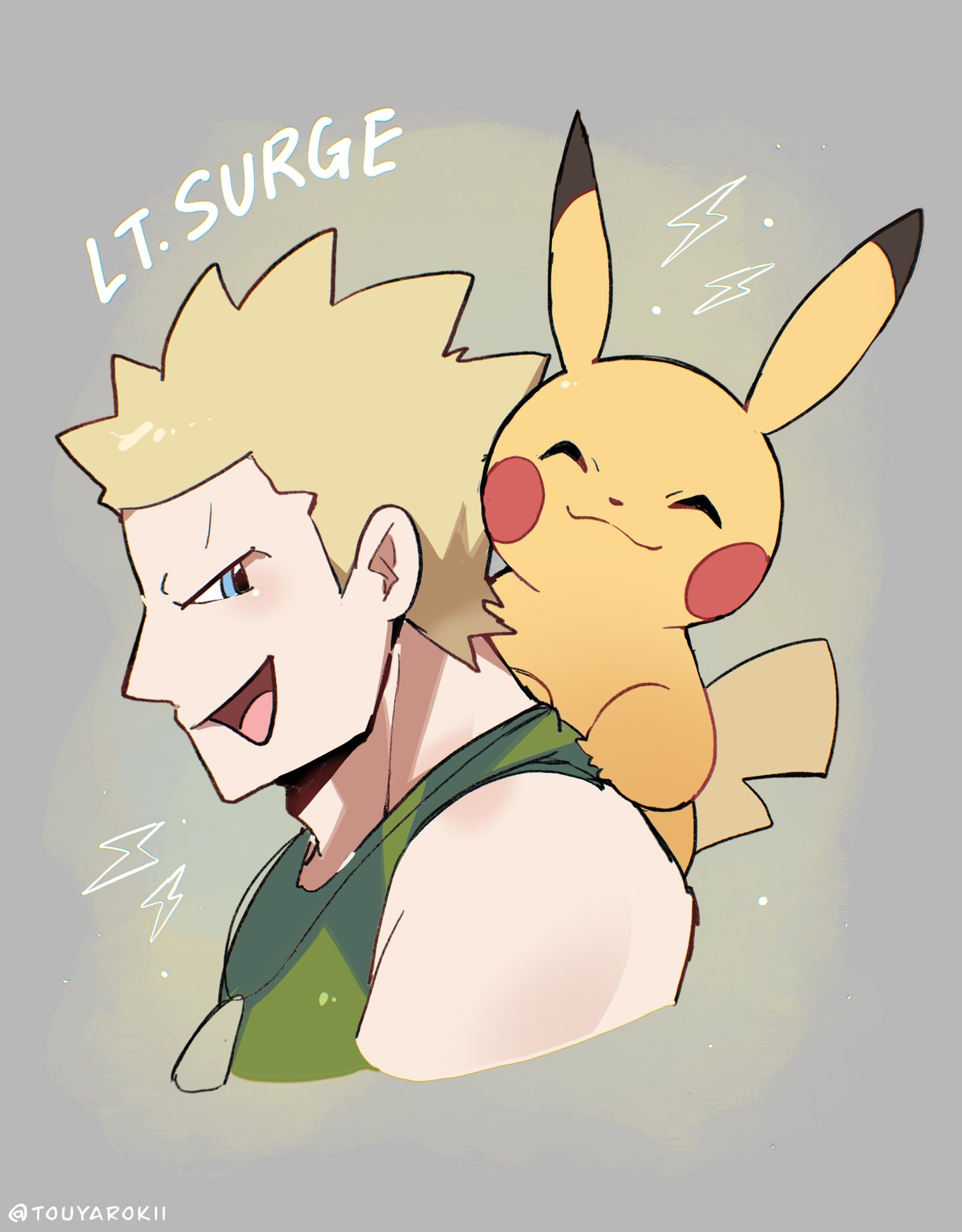 1boy artist_name blonde_hair blue_eyes character_name closed_eyes colored_skin commentary english_commentary gen_1_pokemon green_shirt grey_background highres lightning_bolt_symbol male_focus nintendo open_mouth pikachu pokemon pokemon_(creature) pokemon_heartgold_and_soulsilver shirt short_hair sleeveless sleeveless_shirt smile lt._surge tail touyarokii twitter_username yellow_skin