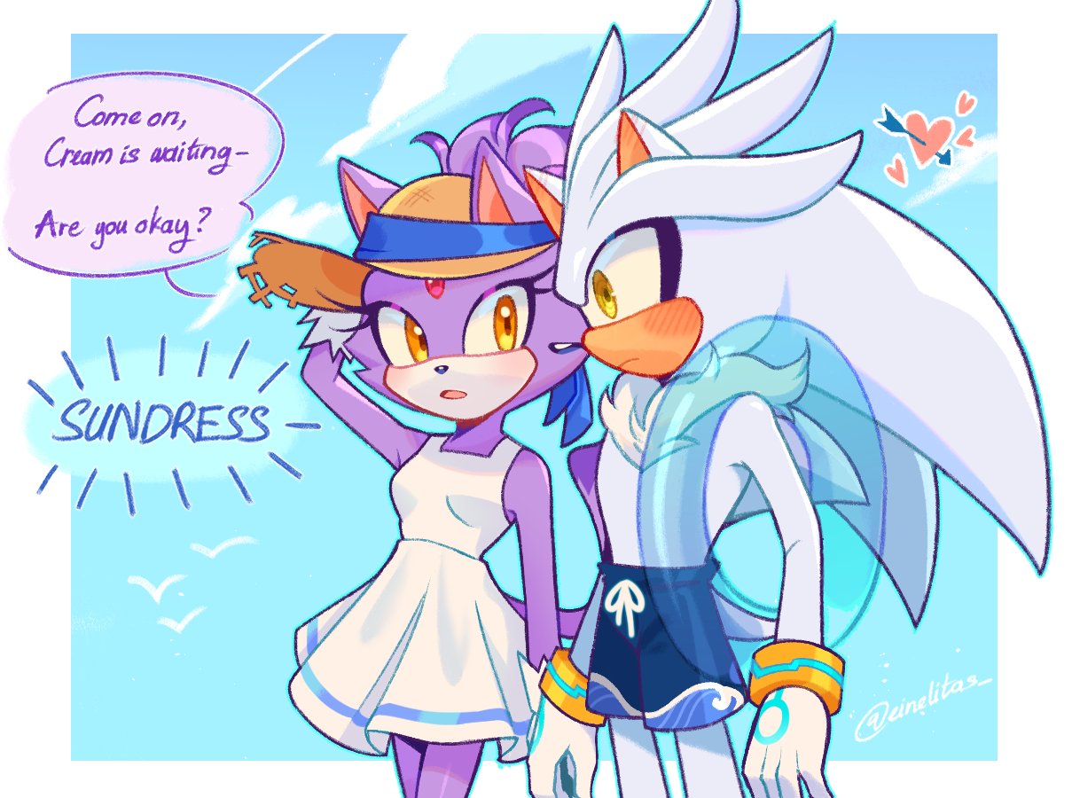 1boy 1girl animal_ears animal_nose arm_up arrow_through_heart artist_name bare_shoulders blaze_the_cat blaze_the_cat_(summer) blue_shorts blue_sky blush body_fur border bracelet breasts brown_headwear cat_ears cat_girl cat_tail closed_mouth cloud cloudy_sky commentary day dress einelitas english_commentary english_text eyelashes forehead_jewel furry furry_female furry_male gem gloves gold_bracelet grey_fur hat heart hedgehog innertube jewelry looking_at_another medium_breasts open_mouth orange_eyes outdoors outside_border purple_fur red_gem ribbon short_tail shorts silver_the_hedgehog sky sleeveless sleeveless_dress sonic_(series) speech_bubble standing swim_ring tail tongue topknot white_border white_dress white_gloves white_ribbon yellow_eyes