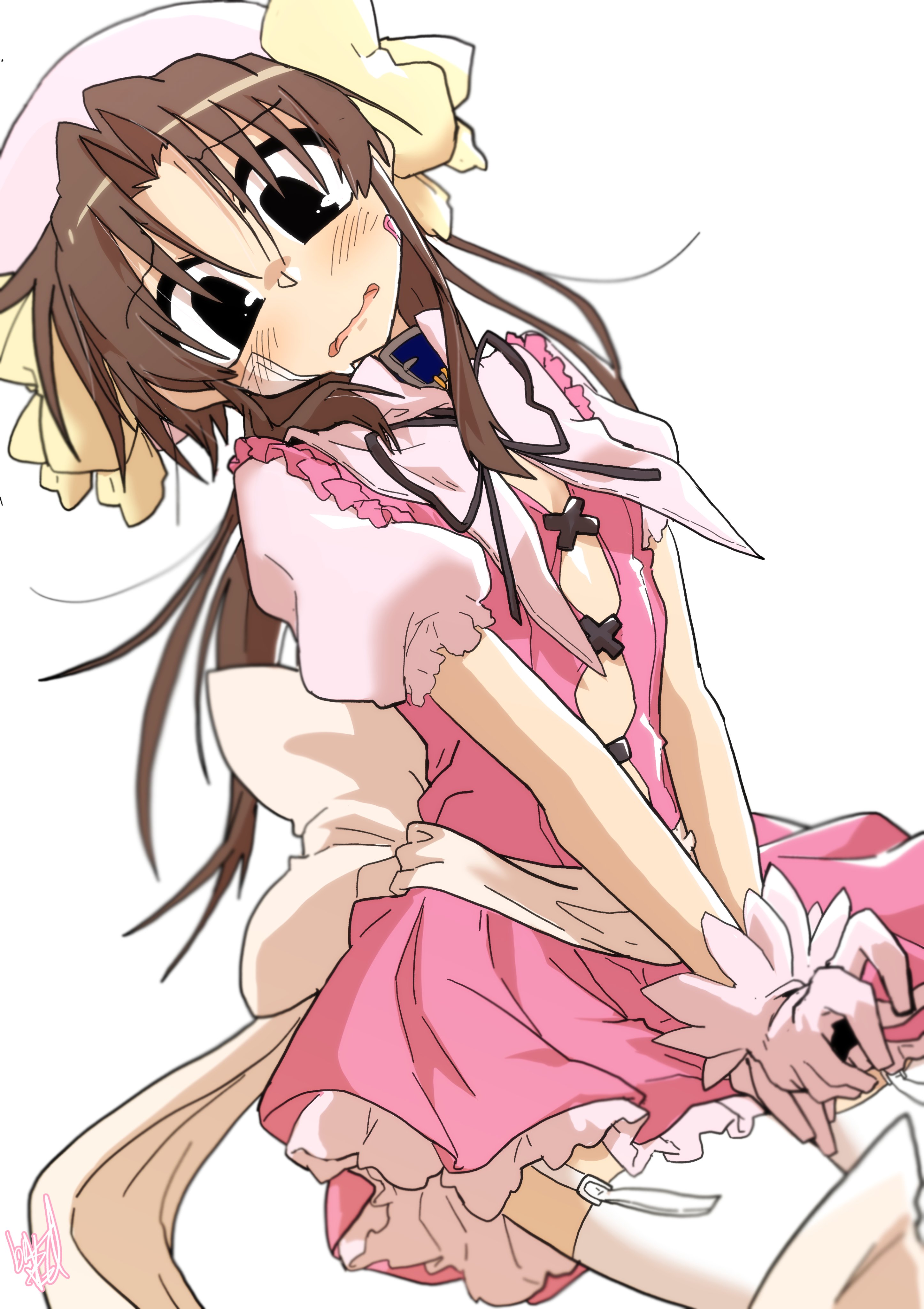 1girl absurdres back_bow bandaid bandaid_on_face black_eyes black_ribbon blue_collar blush bow brown_hair collar dress ed-chan_(edkuroki) edkuroki frilled_wrist_cuffs frills from_below gauze gauze_on_cheek hair_intakes hat highres long_hair looking_down messy_hair open_mouth original own_hands_together pink_dress pink_hat puffy_short_sleeves puffy_sleeves ribbon short_sleeves sidelocks signature simple_background solo thighhighs wavy_mouth white_background white_bow white_thighhighs wrist_cuffs