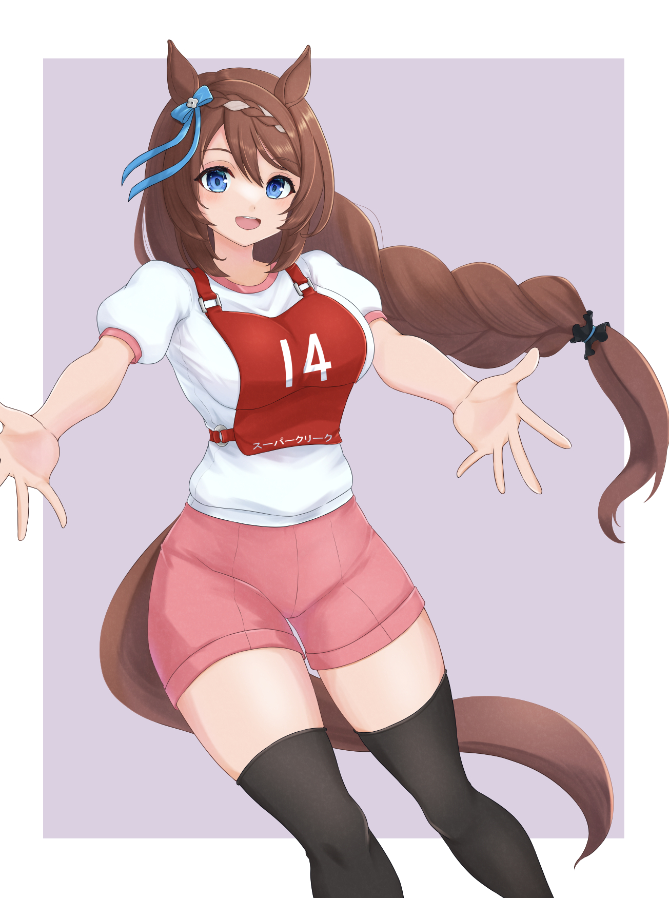 1girl animal_ears black_thighhighs blue_eyes bow braid braided_ponytail brown_hair character_name commentary ear_ribbon grey_background gym_shirt gym_shorts gym_uniform highres horse_ears horse_girl horse_tail kemuri_(etep3372) long_hair looking_at_viewer low-tied_long_hair open_mouth pink_shorts race_bib reaching reaching_towards_viewer shirt short_sleeves shorts single_braid smile solo standing super_creek_(umamusume) t-shirt tail thighhighs translated umamusume white_shirt