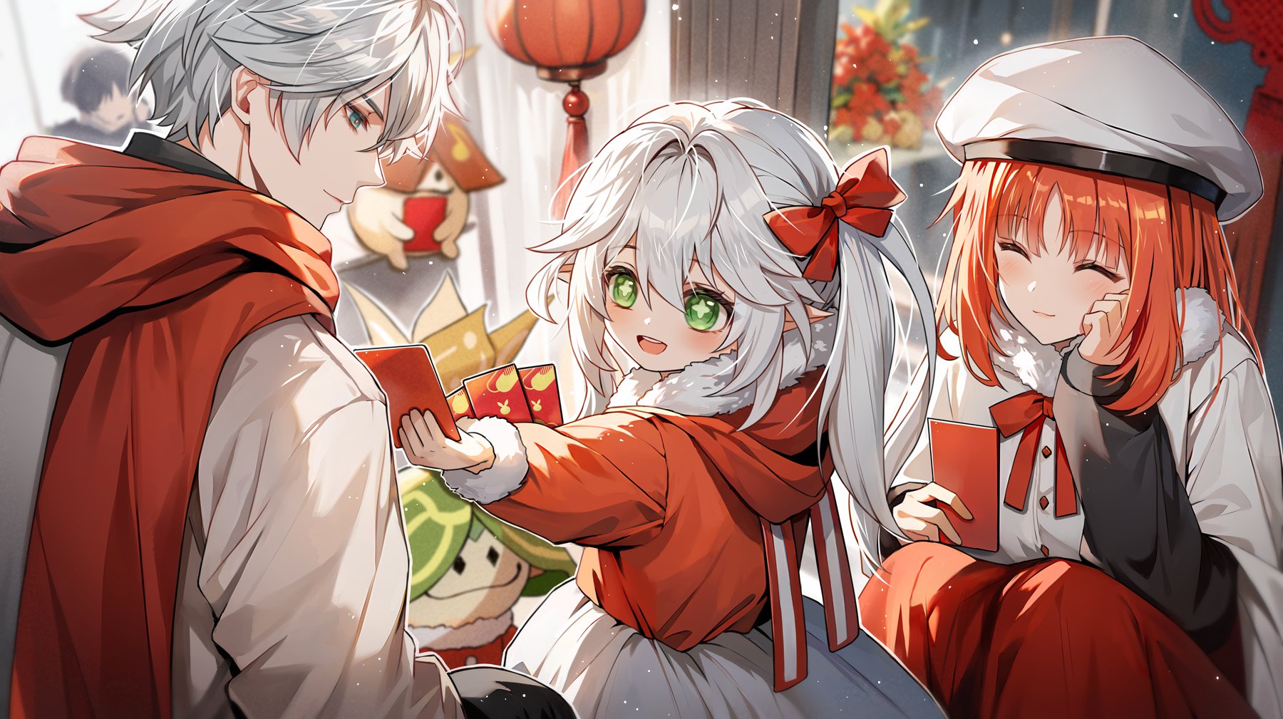 2boys 2girls aguaaaaa4 alhaitham_(genshin_impact) aqua_eyes aranara_(genshin_impact) bow chinese_new_year closed_eyes closed_mouth cross-shaped_pupils fur_trim genshin_impact green_eyes grey_hair hair_between_eyes hair_bow highres jacket long_hair long_sleeves multiple_boys multiple_girls nahida_(genshin_impact) nilou_(genshin_impact) open_mouth pointy_ears red_hair red_hood red_jacket red_scarf scaramouche_(genshin_impact) scarf short_hair smile symbol-shaped_pupils wanderer_(genshin_impact)