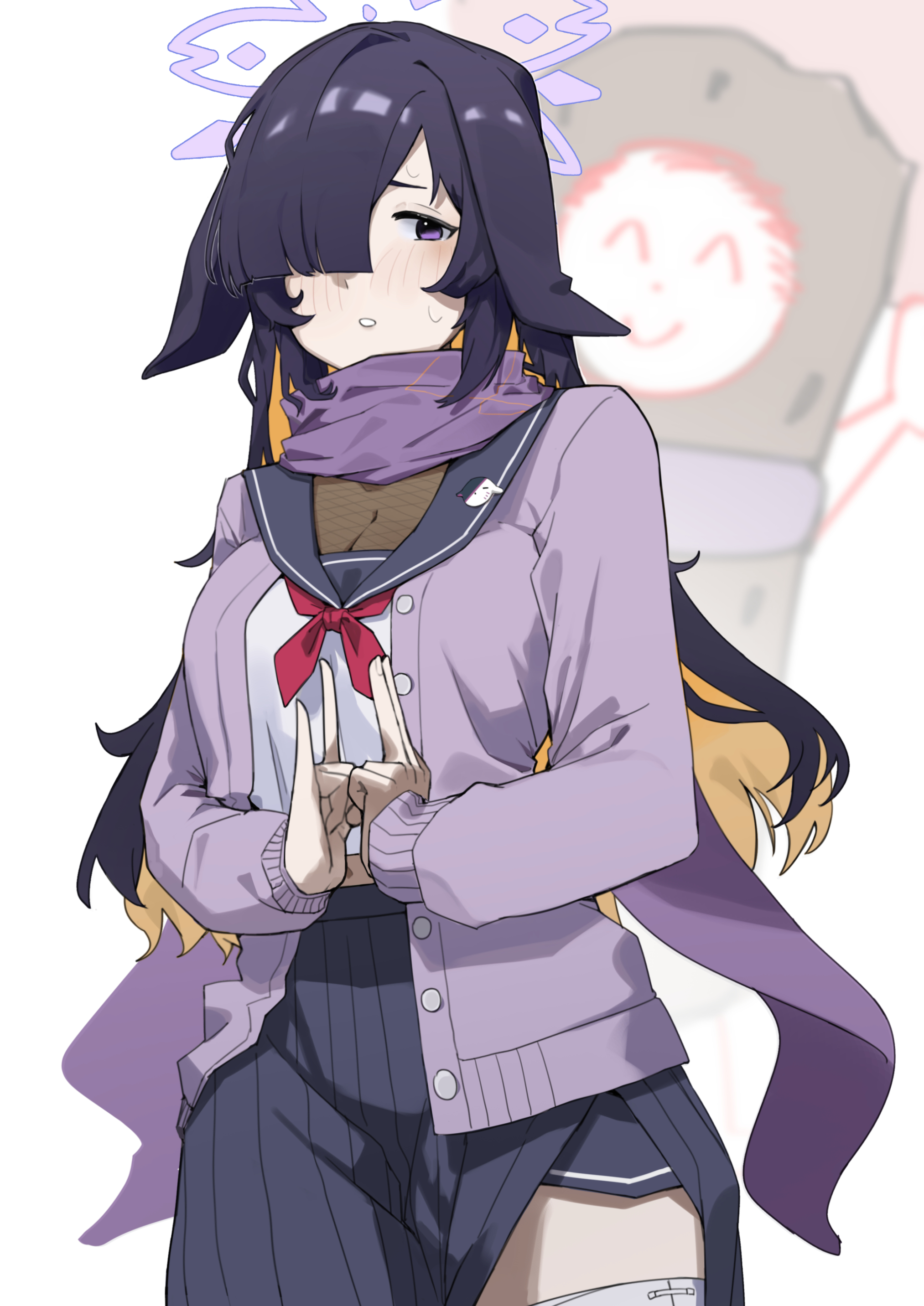 1boy 1girl absurdres animal_ears black_sailor_collar black_skirt blue_archive blush buttons cardigan cowboy_shot doodle_sensei_(blue_archive) hair_over_one_eye halo highres long_hair long_sleeves looking_at_viewer namae_kunn open_cardigan open_clothes parted_lips pleated_skirt purple_cardigan purple_eyes purple_hair purple_halo purple_scarf sailor_collar scarf school_uniform sensei_(blue_archive) serafuku simple_background skirt solo_focus tsukuyo_(blue_archive) white_background