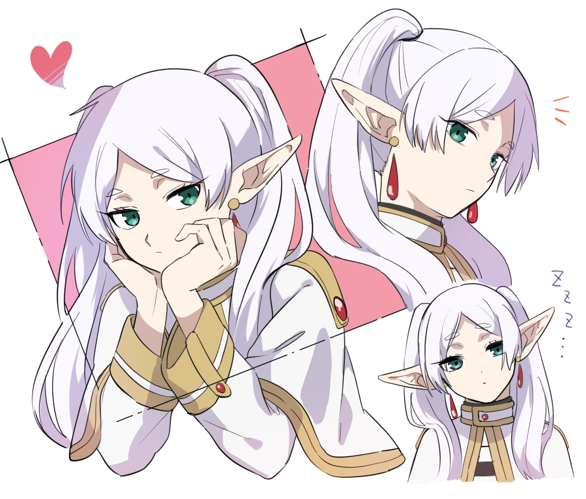 1girl aqua_eyes capelet closed_mouth cropped_torso earrings elf expressionless frieren hair_over_shoulder hands_on_own_cheeks hands_on_own_face hands_up head_rest head_tilt heart jewelry long_hair long_sleeves looking_at_viewer multiple_views pointy_ears poteke shirt sideways_glance sousou_no_frieren striped_clothes striped_shirt twintails white_background white_capelet white_hair
