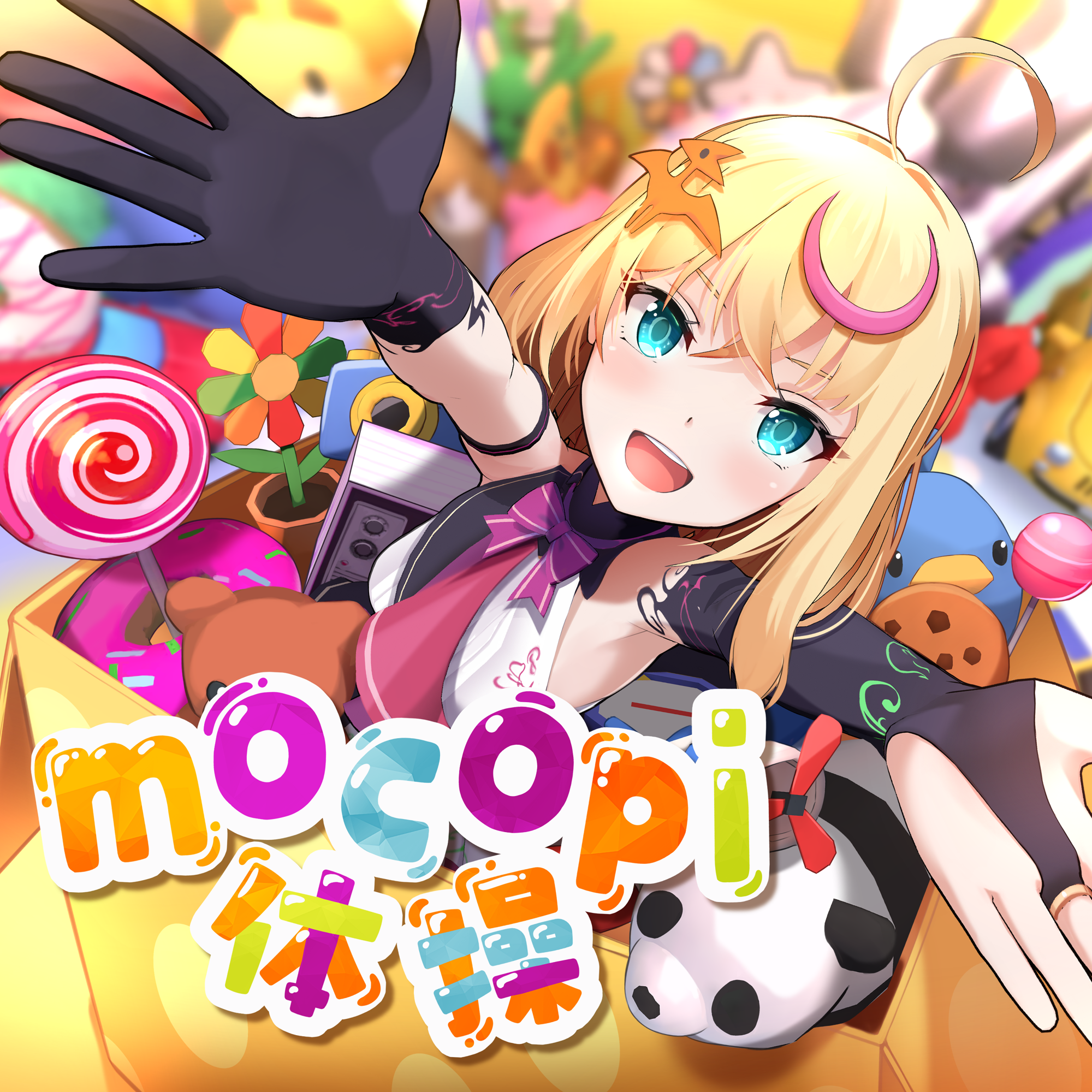 1girl ahoge album_cover aqua_eyes black_collar black_gloves black_sleeves blonde_hair blurry blurry_background bow bowtie box camera candy check_copyright collar collared_shirt cookie copyright_request cover crescent crescent_hair_ornament detached_sleeves dinosaur dinosaur_hair_ornament donut eyelashes flower food gloves hair_ornament highres in_box in_container indoors jewelry light_blush lollipop long_sleeves looking_at_viewer medium_hair open_mouth original outstretched_arms plant potted_plant purple_bow purple_bowtie ring shiroino_(shirayuki_mutsuki) shirt single_detached_sleeve single_glove sleeveless sleeveless_shirt sleeves_past_wrists smile solo stuffed_animal stuffed_panda stuffed_penguin stuffed_toy teddy_bear teeth upper_body upper_teeth_only white_shirt