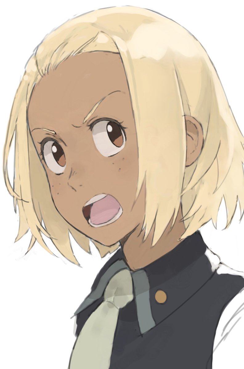 1girl blonde_hair brown_eyes dark-skinned_female dark_skin flcl freckles highres hirooka_masaki kitsurubami looking_at_viewer military_uniform necktie open_mouth short_hair simple_background solo white_background