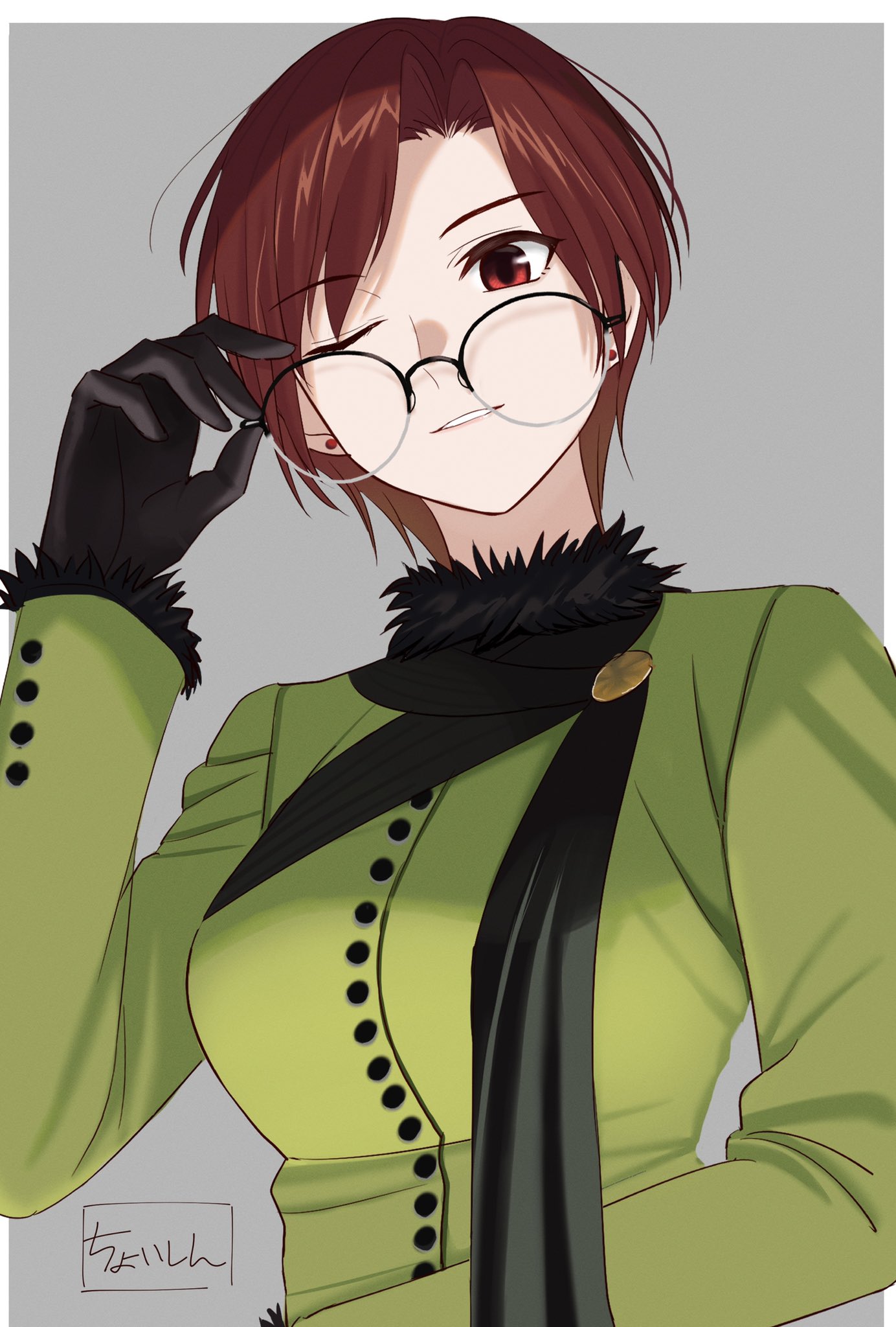 1girl aozaki_touko aozaki_touko_(mahou_tsukai_no_yoru) black-framed_eyewear black_gloves black_scarf border brown_hair buttons commentary_request fur-trimmed_sleeves fur_collar fur_trim glasses gloves green_jacket grey_background grin highres jacket looking_at_viewer mahou_tsukai_no_yoru one_eye_closed outside_border red_eyes removing_eyewear round_eyewear scarf shintyoi2 short_hair simple_background smile solo white_border