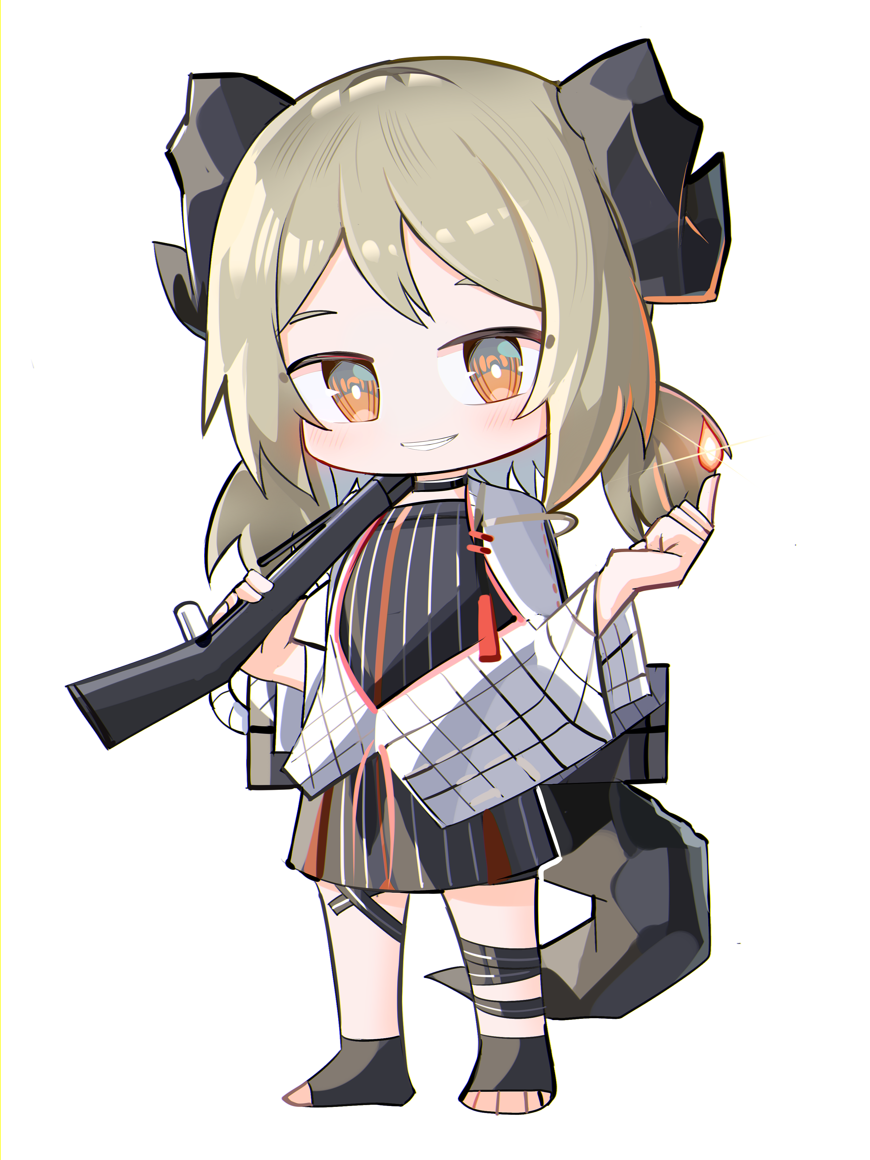 1girl absurdres arknights black_choker black_dress black_shoes brown_eyes chibi choker dress eyebrows_hidden_by_hair fire full_body grin gun highres holding holding_gun holding_weapon horns ifrit_(arknights) jacket light_brown_hair looking_at_viewer low_twintails open-toe_shoes pyrokinesis shoes simple_background smile solo spam_(spamham4506) standing tail twintails weapon weapon_request white_background white_jacket