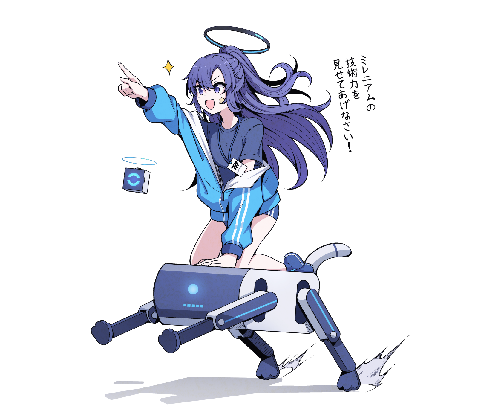 1girl black_shirt blue_archive blue_buruma blue_jacket buruma halo highres id_card jacket karikura_(atatata71) long_hair long_sleeves mechanical_halo official_alternate_costume official_alternate_hairstyle open_mouth partially_unzipped ponytail purple_eyes purple_hair shirt short_sleeves simple_background smile solo star_(symbol) track_jacket translation_request white_background yuuka_(blue_archive) yuuka_(track)_(blue_archive)
