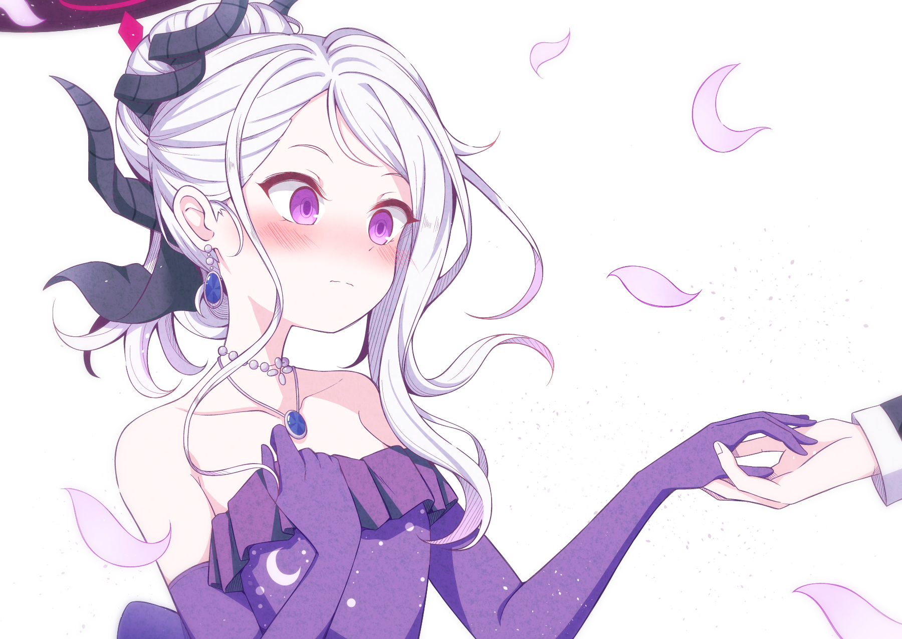 1girl 1other black_horns blue_archive blush closed_mouth collarbone demon_horns dress earrings elbow_gloves floating_earrings gloves grey_hair halo highres hina_(blue_archive) hina_(dress)_(blue_archive) horns jewelry karikura_(atatata71) long_hair multiple_horns necklace official_alternate_costume official_alternate_hairstyle pendant purple_dress purple_eyes purple_gloves simple_background solo_focus strapless strapless_dress white_background