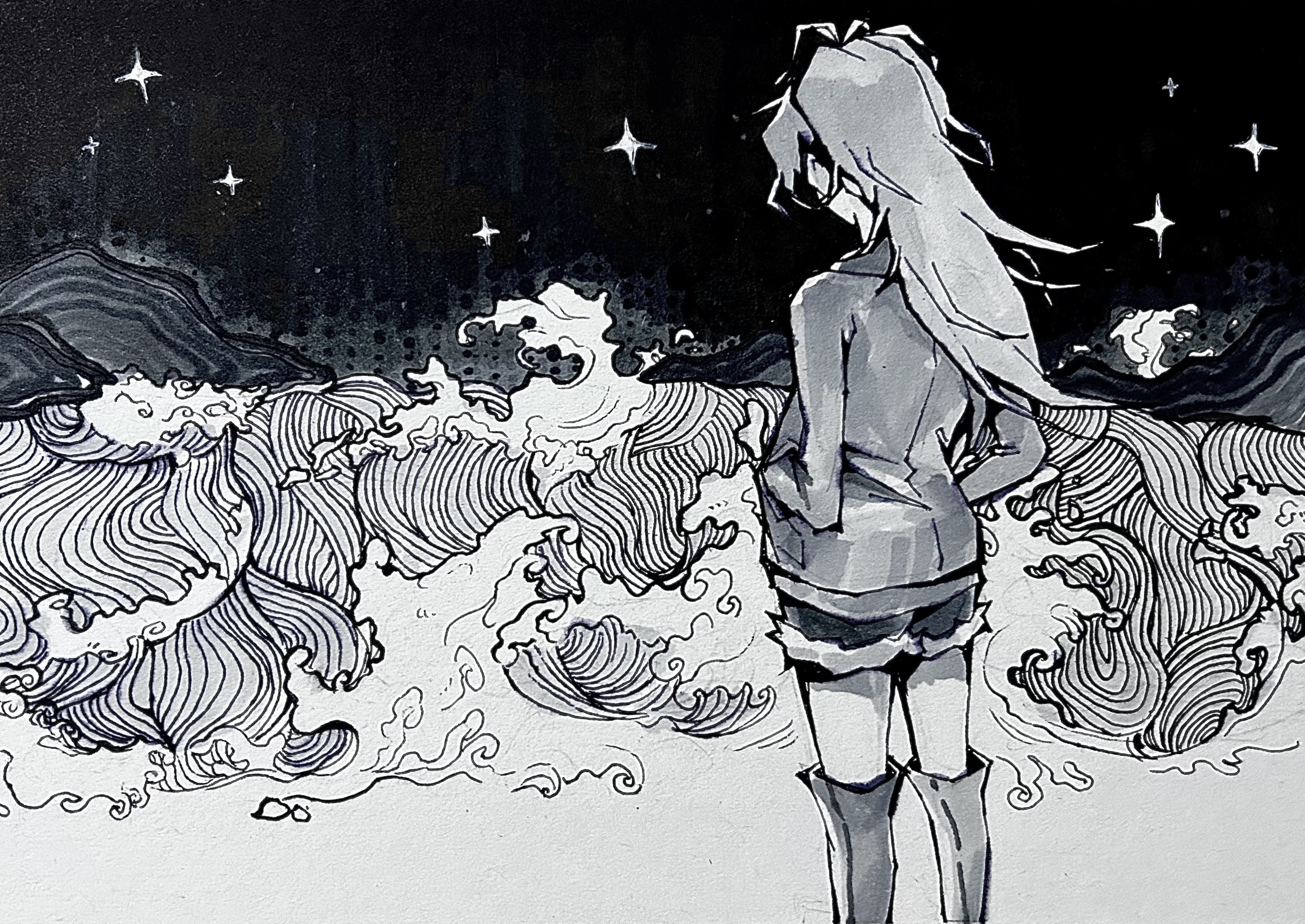 1girl boots chinese_commentary commentary_request denim denim_shorts from_behind greyscale hands_in_pockets highres knee_boots long_hair long_sleeves mahou_shoujo_madoka_magica mahou_shoujo_madoka_magica_(anime) monochrome ponytail sakura_kyoko shao_ziye shorts solo sparkle traditional_media water waves