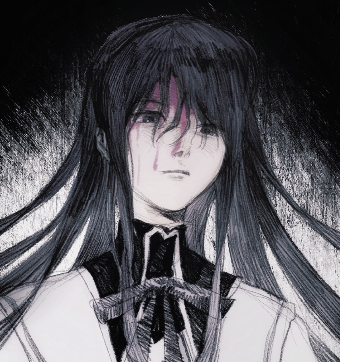 1girl akemi_homura akemi_homura_(magical_girl) black_background black_eyes black_hair black_ribbon chinese_commentary closed_mouth commentary_request expressionless highres long_hair mahou_shoujo_madoka_magica mahou_shoujo_madoka_magica_(anime) mitakihara_school_uniform neck_ribbon portrait ribbon school_uniform shao_ziye solo tears white_background