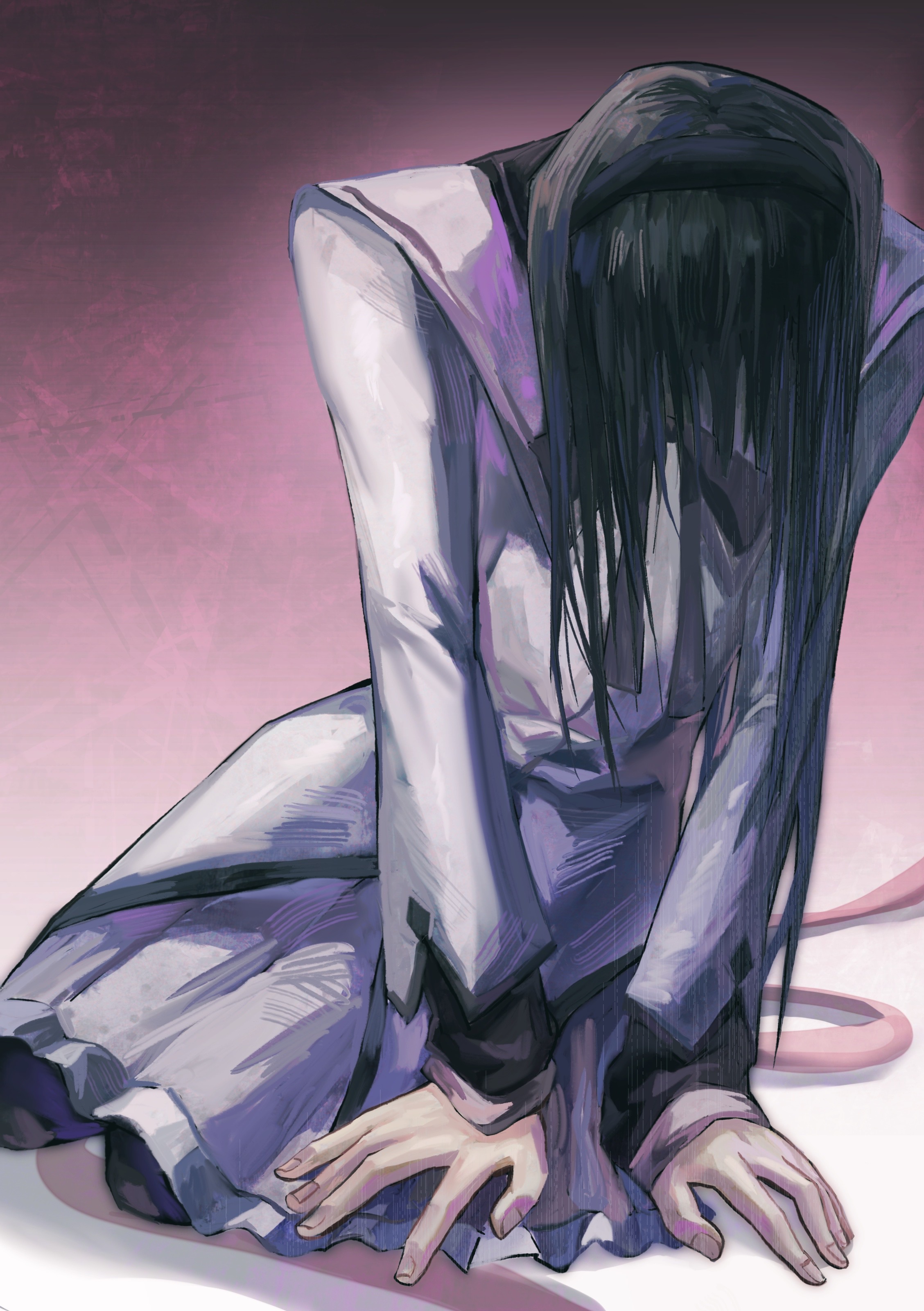 1girl absurdres akemi_homura akemi_homura_(magical_girl) black_background black_hair black_hairband black_pantyhose black_ribbon chinese_commentary commentary_request gradient_background grey_skirt hairband highres long_hair long_sleeves looking_down mahou_shoujo_madoka_magica mahou_shoujo_madoka_magica_(anime) mitakihara_school_uniform neck_ribbon pantyhose pink_background pink_ribbon pleated_skirt ribbon school_uniform seiza shao_ziye shirt sitting skirt solo white_background white_shirt