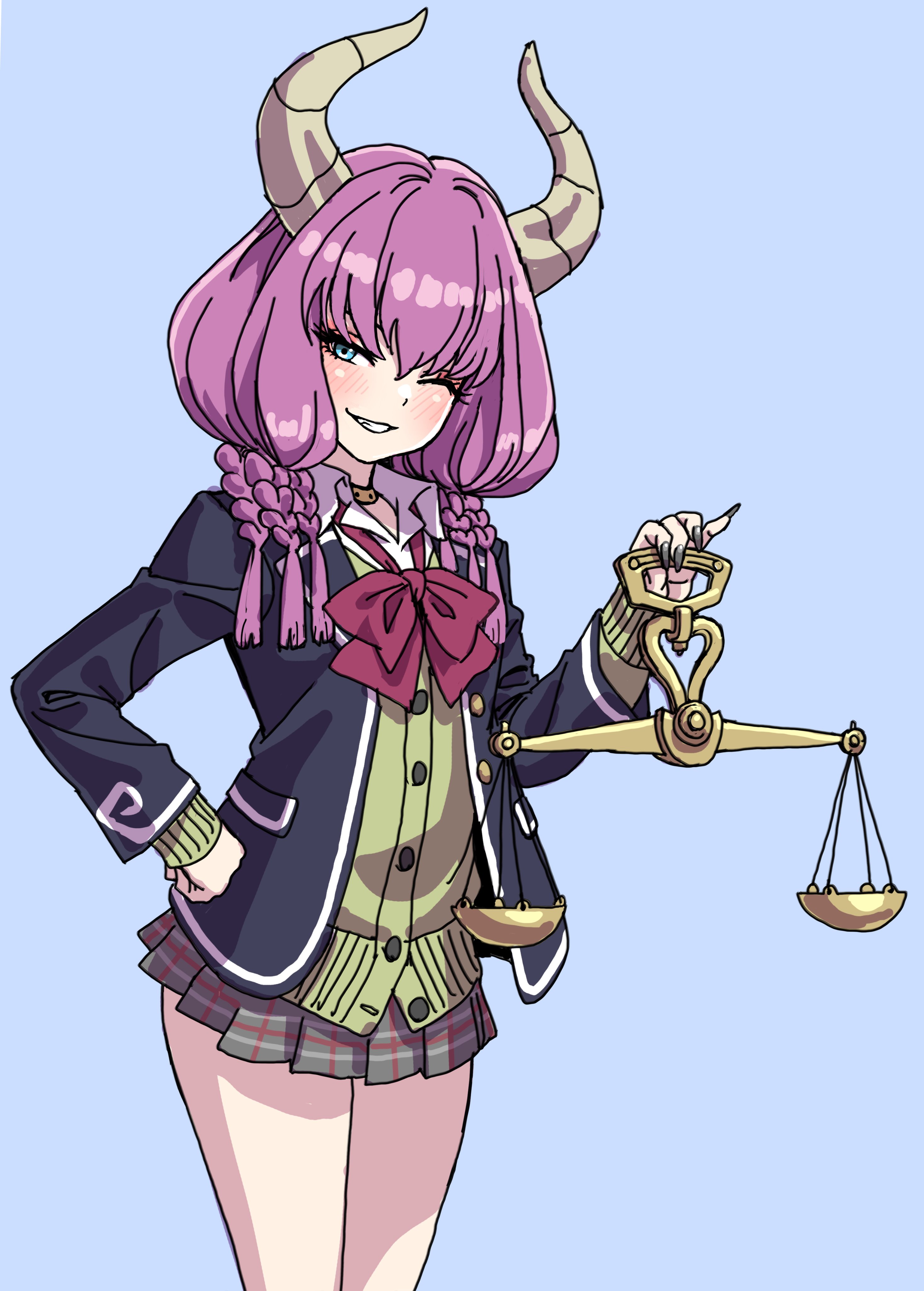 1girl absurdres alternate_costume aura_(sousou_no_frieren) black_nails blue_background blue_eyes blue_jacket fingernails green_jacket grey_skirt hand_on_own_hip highres jacket long_fingernails looking_at_viewer one_eye_closed open_clothes open_jacket plaid_clothes plaid_skirt purple_hair school_uniform skirt smile solo sousou_no_frieren yamashita_shun'ya