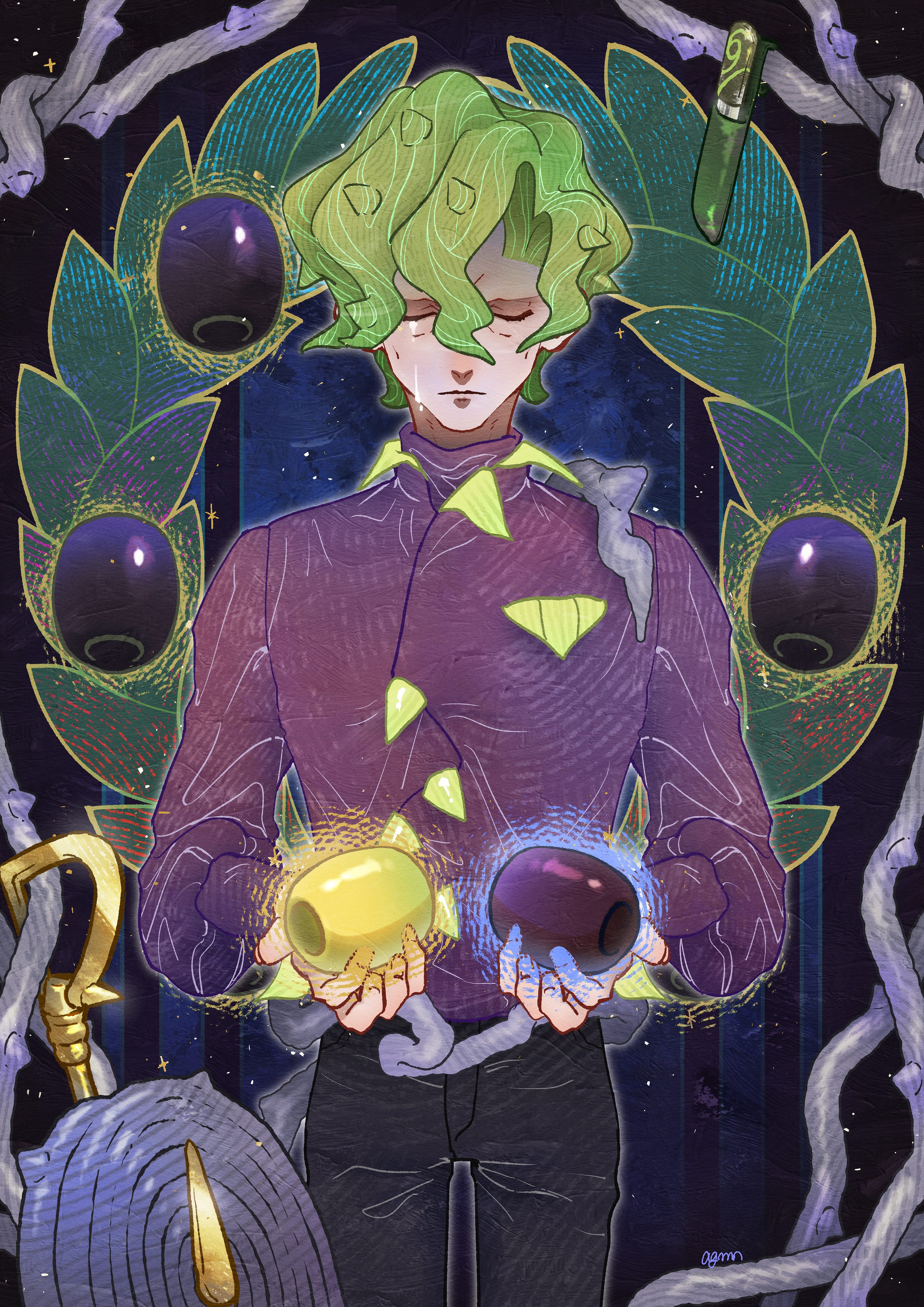 1boy absurdres black_pants brassius_(pokemon) closed_eyes closed_mouth commentary_request cowboy_shot crying facing_viewer green_hair hair_between_eyes hasekou_g highres holding jacket long_sleeves male_focus nintendo olive pants plant pokemon pokemon_scarlet_and_violet purple_jacket sad short_hair tears vines whip