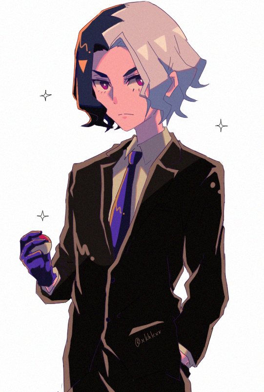 1boy amethio_(pokemon) black_suit blue_gloves blue_necktie formal_clothes g_(xkhkxx) gloves hand_in_pocket holding holding_poke_ball multicolored_hair necktie nintendo poke_ball pokemon pokemon_(anime) pokemon_horizons red_eyes simple_background solo standing suit twitter_username two-tone_hair white_background