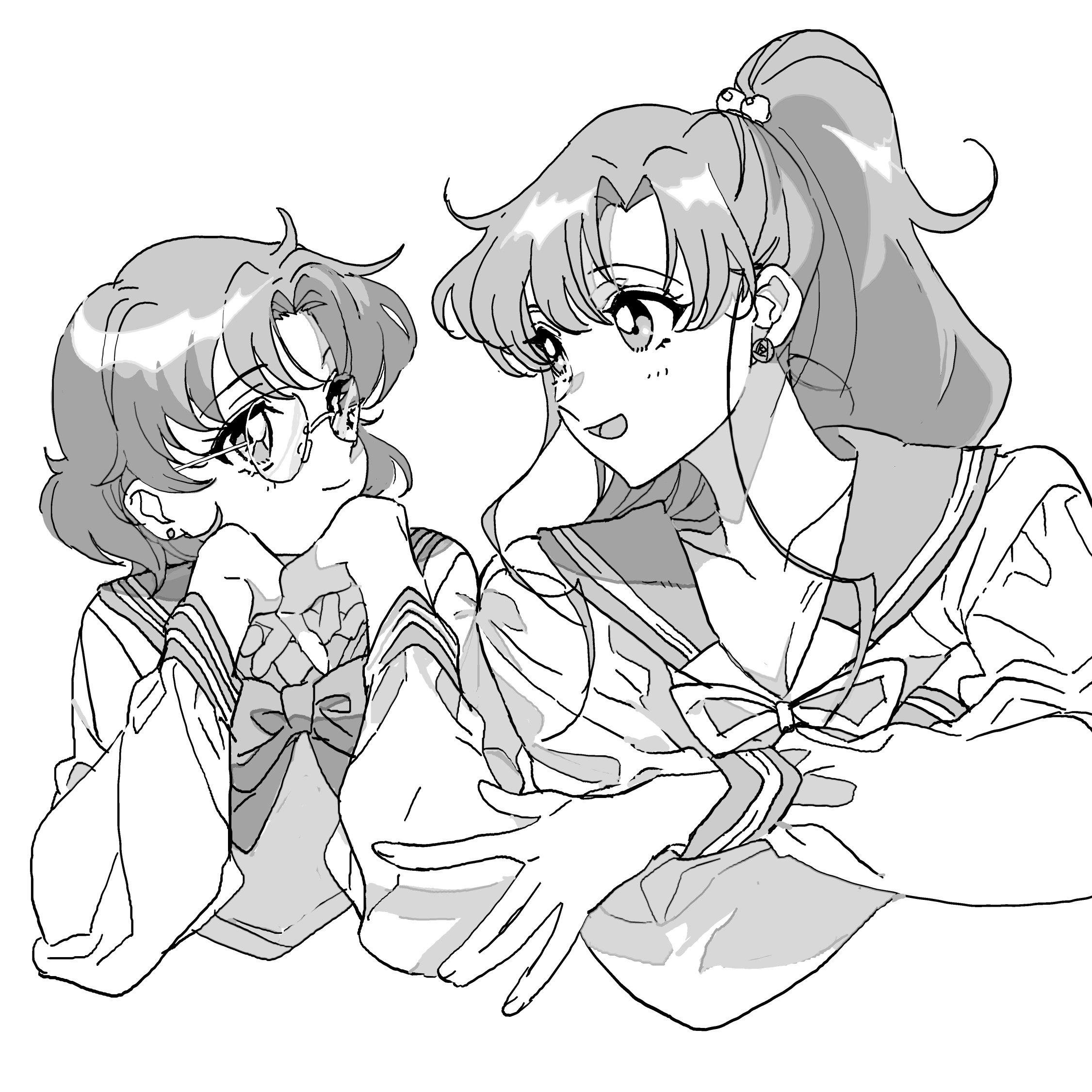 2girls arm_support bishoujo_senshi_sailor_moon bow bowtie collarbone earrings glasses hair_bobbles hair_ornament high_ponytail highres interlocked_fingers jewelry kino_makoto long_hair looking_at_another mizuno_ami monochrome multiple_girls ponytail round_eyewear sailor_collar school_uniform serafuku shiroi_uma short_hair simple_background upper_body white_background