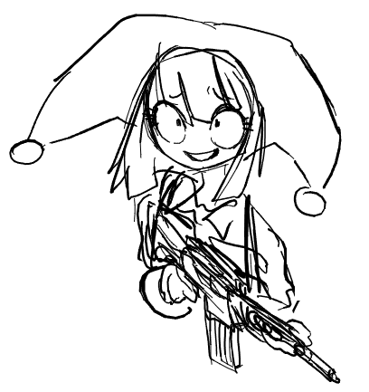 1girl androshift assault_rifle doodle gun hat jester_cap monochrome pomni_(the_amazing_digital_circus) rifle simple_background sketch smile the_amazing_digital_circus weapon