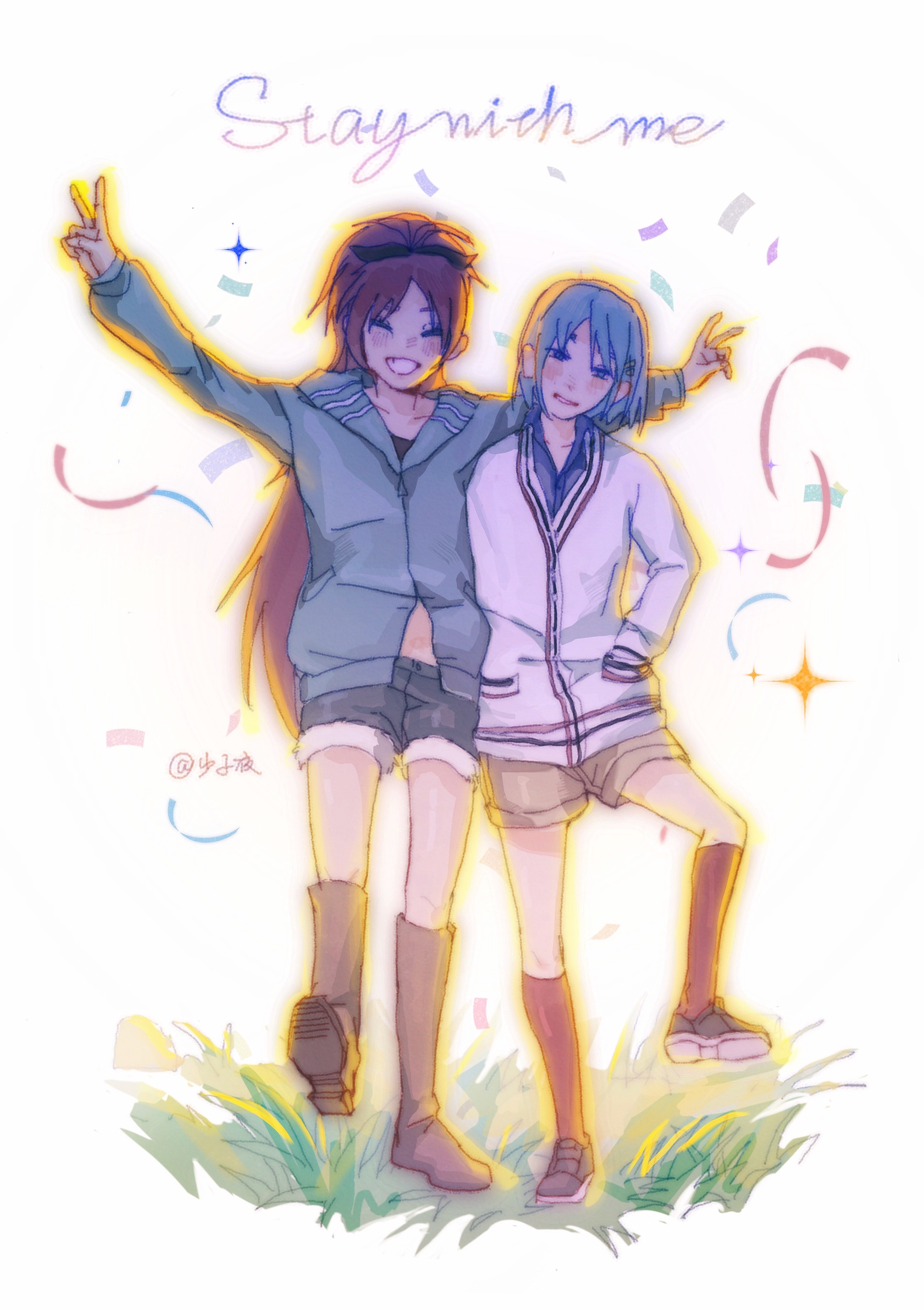 2girls absurdres artist_name black_footwear blue_eyes blue_hair blue_jacket boots closed_eyes commentary confetti cursive denim denim_shorts english_commentary english_text full_body grass grey_footwear grey_shorts highres jacket kneehighs long_hair long_sleeves mahou_shoujo_madoka_magica mahou_shoujo_madoka_magica_(anime) miki_sayaka multiple_girls open_mouth outstretched_arms parted_lips ponytail red_hair red_socks sakura_kyoko shao_ziye short_hair shorts simple_background smile socks sparkle very_long_hair white_background white_jacket
