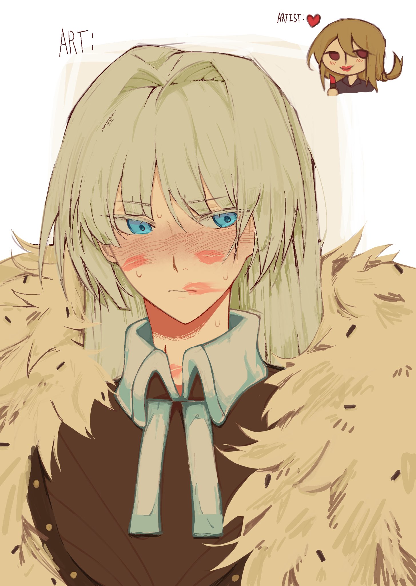 2girls black_shirt blue_eyes blush brown_hair cape chibi closed_mouth collared_shirt commentary cosmetics dikke_(reverse:1999) embarrassed english_commentary english_text fur-trimmed_cape fur_trim highres holding holding_lipstick_tube lipstick_mark lipstick_tube long_hair multiple_girls red_eyes reverse:1999 shirt simple_background sweat sy_no tennant_(reverse:1999) upper_body white_background white_hair yuri