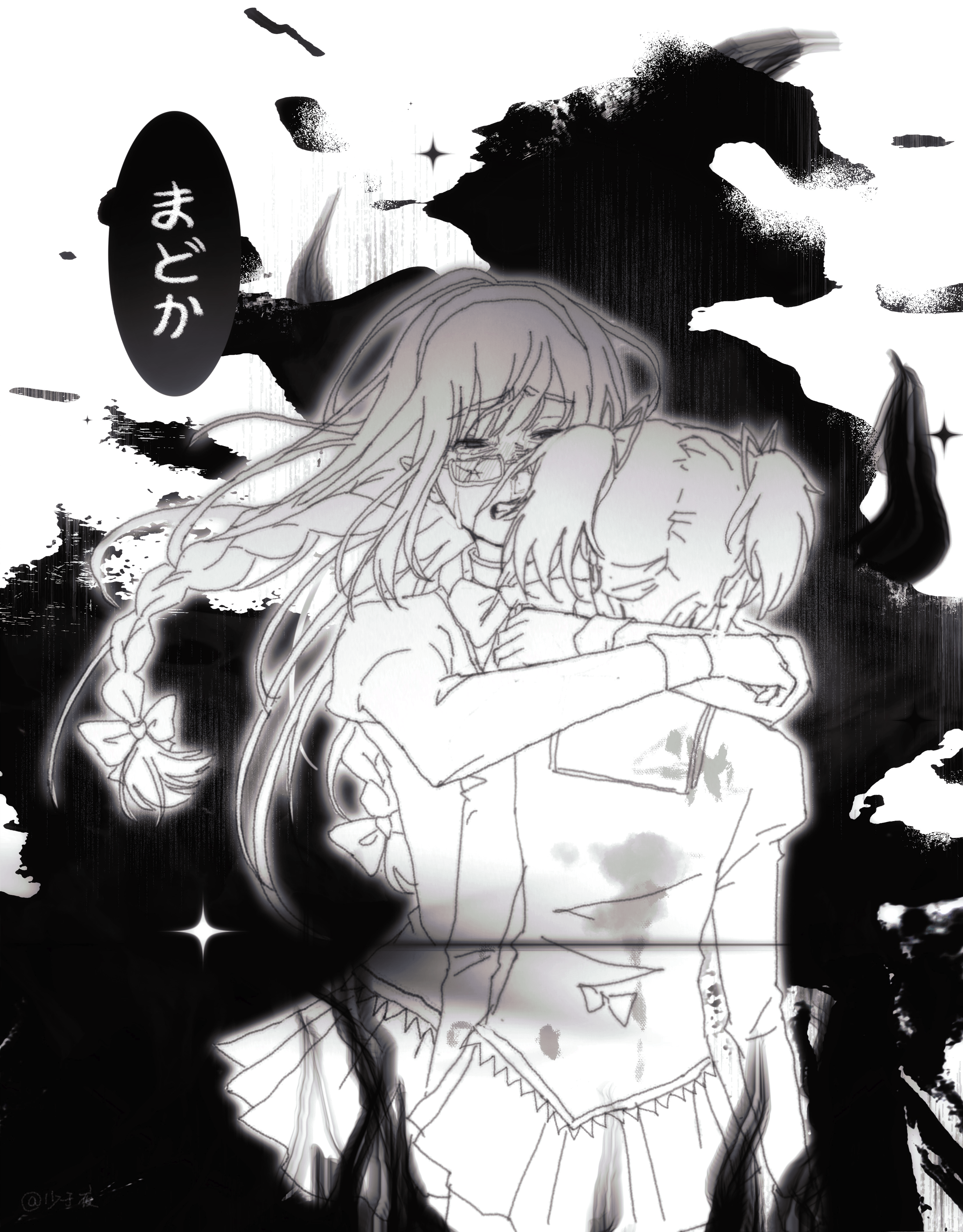 2girls absurdres akemi_homura blood blood_on_clothes braid broken_eyewear chinese_commentary commentary_request crying crying_with_eyes_open explosion glasses greyscale hair_ribbon highres hug juliet_sleeves kaname_madoka long_hair long_sleeves mahou_shoujo_madoka_magica mahou_shoujo_madoka_magica_(anime) mitakihara_school_uniform monochrome multiple_girls open_mouth plaid_clothes plaid_skirt pleated_skirt puffy_sleeves ribbon school_uniform shao_ziye short_hair skirt smoke sparkle speech_bubble tears translated twin_braids twintails
