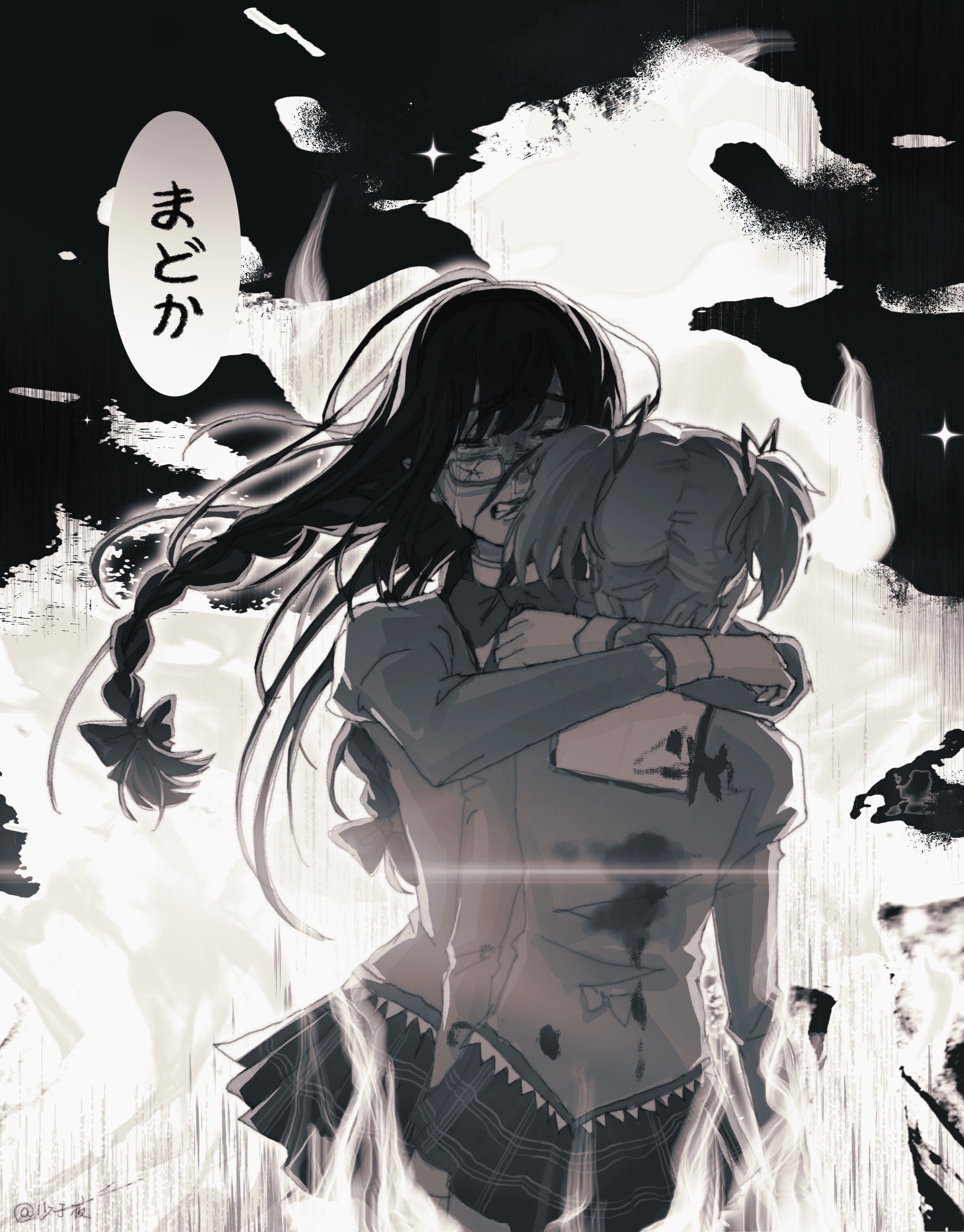 2girls absurdres akemi_homura blood blood_on_clothes braid broken_eyewear chinese_commentary commentary_request crying crying_with_eyes_open explosion glasses greyscale hair_ribbon highres hug juliet_sleeves kaname_madoka long_hair long_sleeves mahou_shoujo_madoka_magica mahou_shoujo_madoka_magica_(anime) mitakihara_school_uniform monochrome multiple_girls open_mouth plaid_clothes plaid_skirt pleated_skirt puffy_sleeves ribbon school_uniform shao_ziye short_hair skirt smoke sparkle speech_bubble tears translated twin_braids twintails