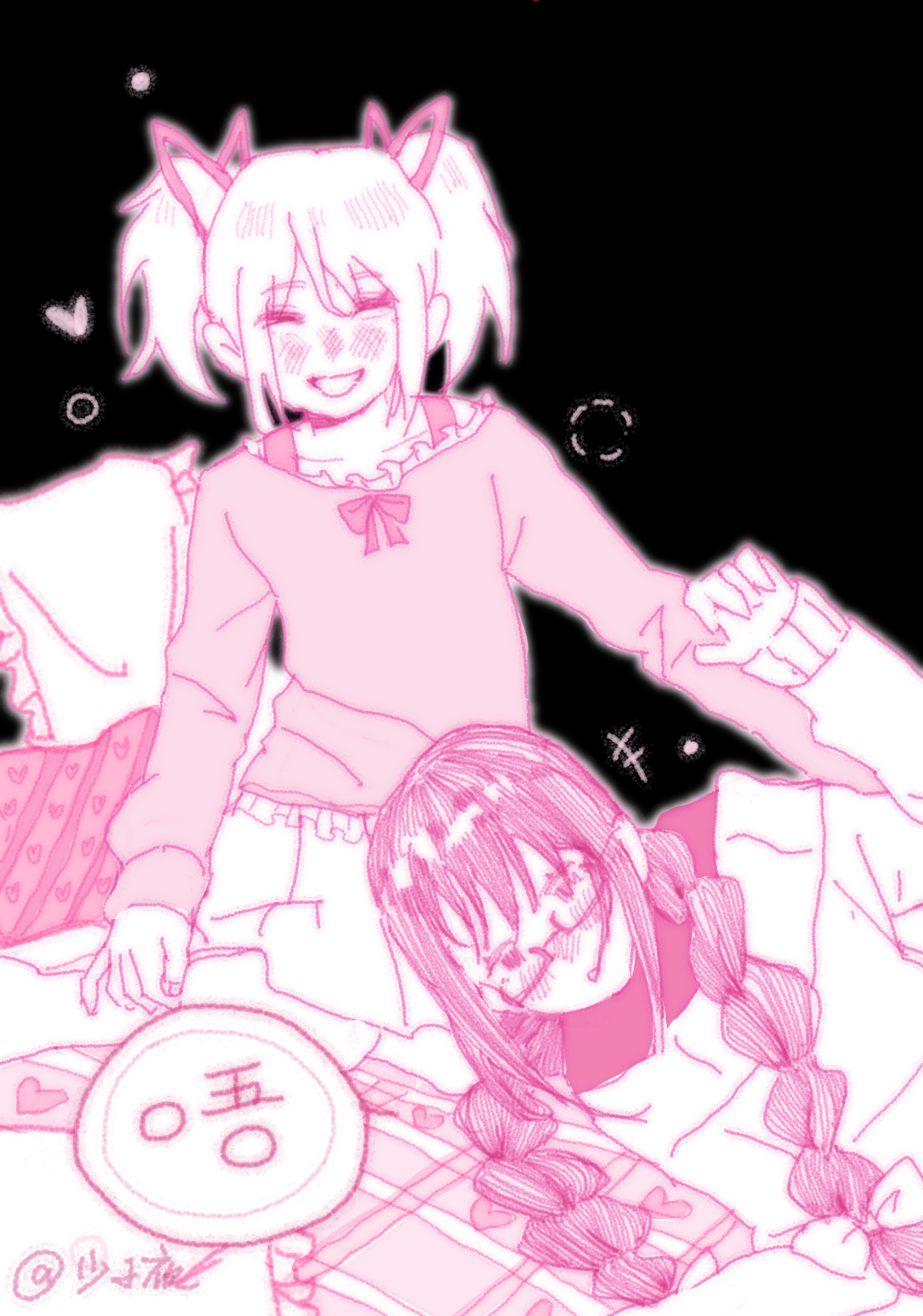 22/7 2girls absurdres akemi_homura artist_name black_background blush bra_strap braid chinese_commentary commentary_request cushion fami_(yellow_skies) glasses hair_ribbon heart highres kaname_madoka long_sleeves looking_at_viewer mahou_shoujo_madoka_magica mahou_shoujo_madoka_magica_(anime) monochrome multiple_girls open_mouth parted_lips pink_theme ribbon shao_ziye shirt smile squeans sweater twin_braids twintails