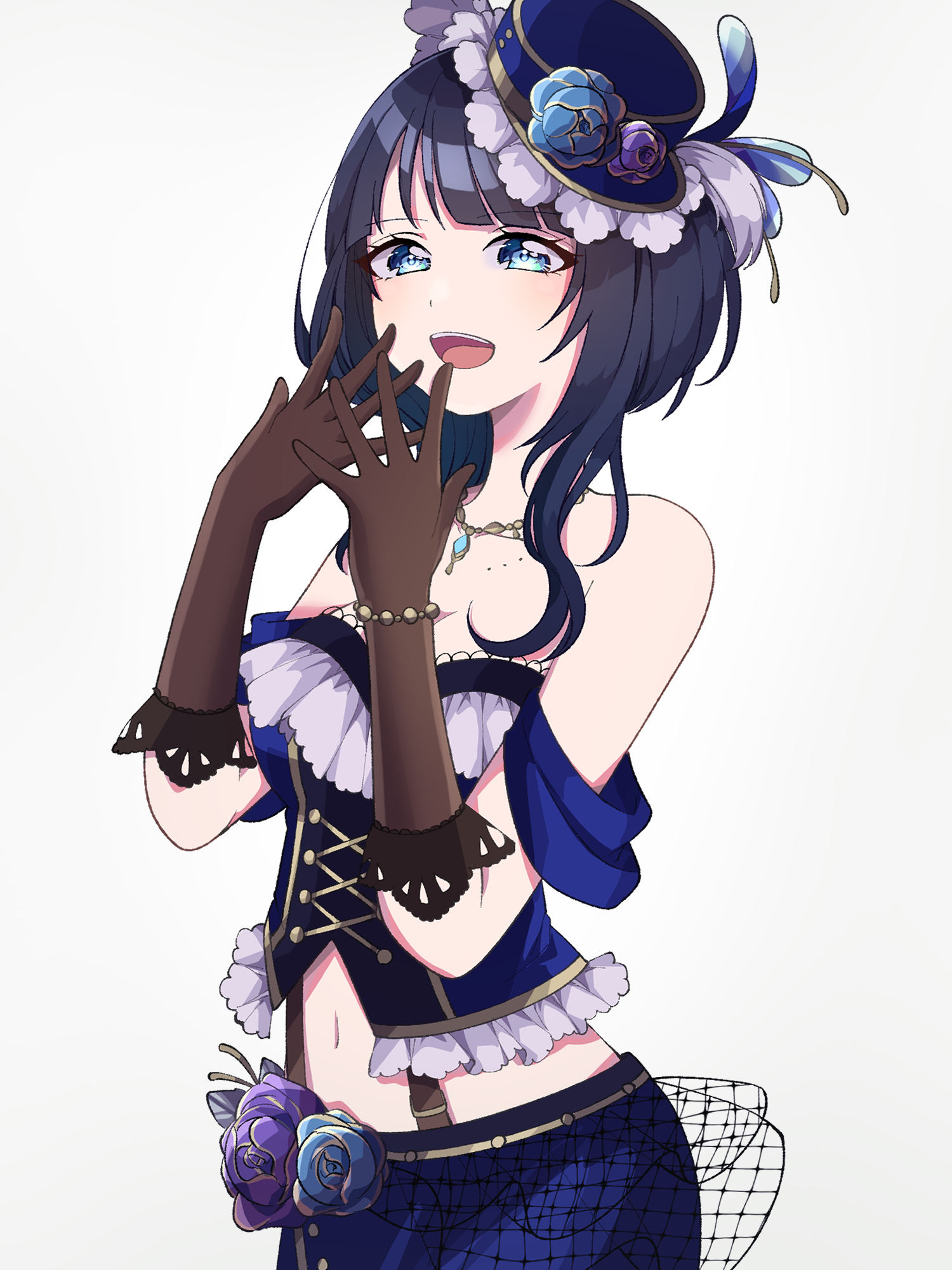 1girl asaka_karin black_gloves blue_eyes blue_hair blue_hat blunt_bangs commentary commentary_request elbow_gloves flower gloves hat hat_flower highres jewelry kam_tuki lace_trim looking_at_viewer love_live! love_live!_nijigasaki_high_school_idol_club medium_hair mole mole_on_body mole_on_collarbone multiple_moles open_mouth sidelocks solo starlight_(love_live!) tilted_headwear upper_body white_background