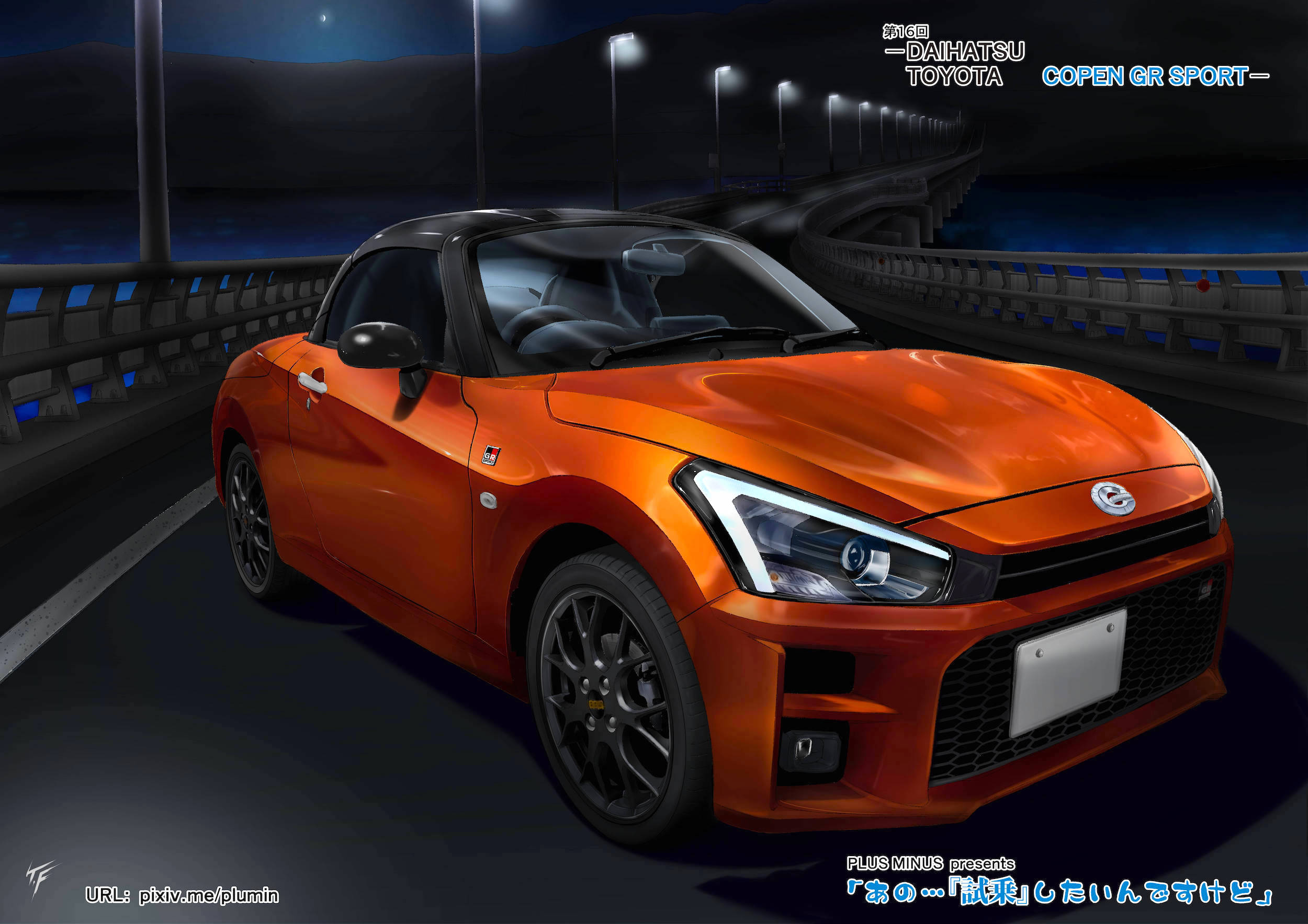 artist_name car daihatsu_copen highres license_plate motor_vehicle night no_humans original outdoors plus_minus_(plumin) road sports_car translation_request vehicle_focus vehicle_name watermark web_address